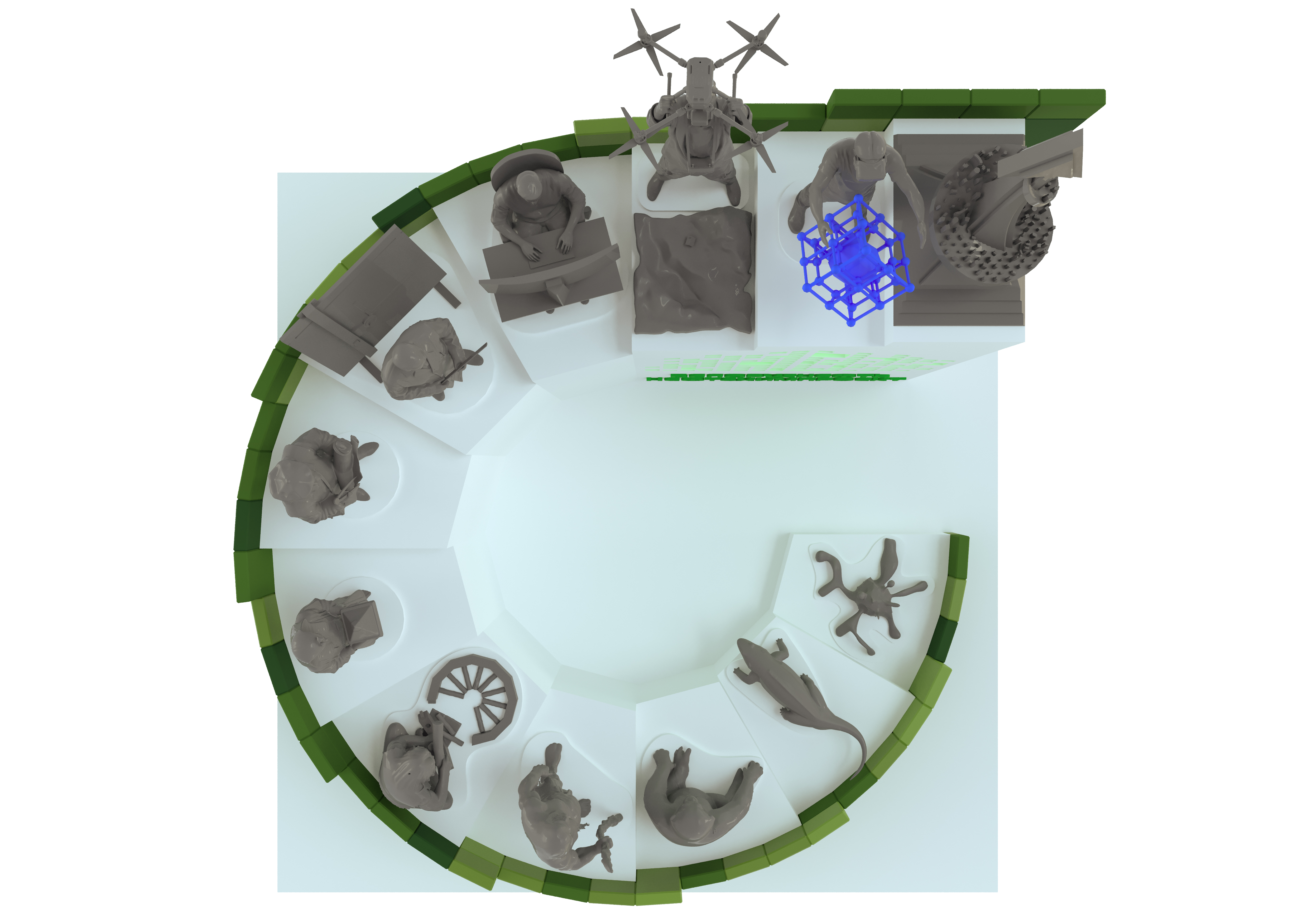 Экспозиция насчитывает 12 ступеней, объединенных в три смысловые фазы: биологическая предыстория, историческая инженерия и цифровое будущее.