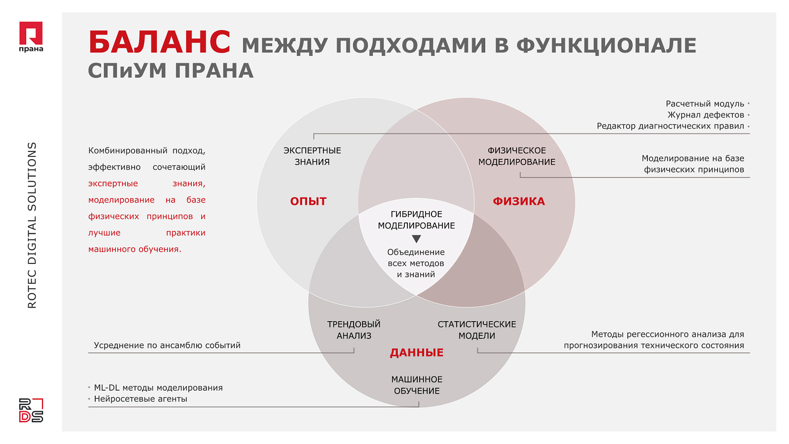 - ПРАНА является крупнейшим независимым архивом исторических данных по промышленному оборудованию среди всех решений, нейтральных к поставщикам. Это позволяет создавать более точные модели и повышать чувствительность диагностики.