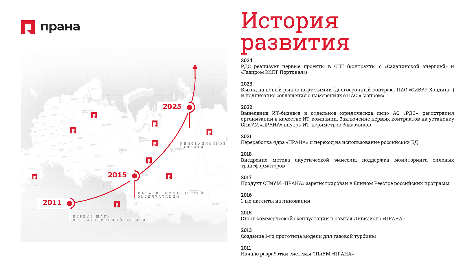 Флагманский продукт компании — система предиктивной аналитики ПРАНА — это промышленное решение на основе технологии многомерных векторных статистических моделей (МВСМ), разработанное специально для условий повышенной опасности, включая атомную энергетику. ПРАНА обеспечивает раннюю диагностику отклонений в работе оборудования — задолго до возникновения аварии, что позволяет перевести обслуживание из реактивного режима в проактивный.