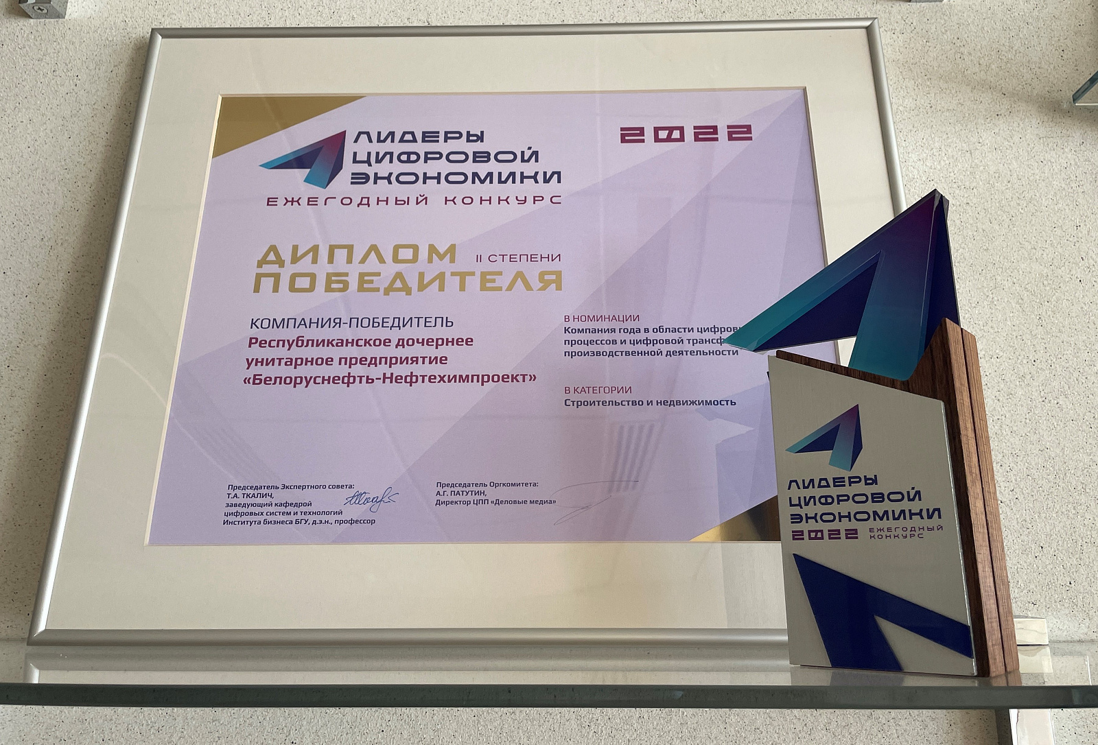 12.01.2023 адбылося пасяджэнне Экспертнай рады, на якім вызначаныя пераможцы першага Рэспубліканскага прафесійнага конкурсу на суісканне прэміі за дасягненні ў галіне цыфравізацыі і лічбавай трансфармацыі «Лідэры лічбавай эканомікі - 2022». Па выніках выстаўлення экспертных ацэнак і правядзення абмеркаванняў Рэспубліканскаму даччынаму унітарнаму прадпрыемству "Беларуснафта-Нафтахімпраект" прысвоены Дыплом пераможцы 2 ступені ў намінацыі Кампанія года ў галіне цыфравізацыі працэсаў і лічбавай трансфармацыі вытворчай дзейнасці. Урачыстая цырымонія ўзнагароджання пераможцаў прайшла 02 лютага ў бізнес-гатэлі «Вікторыя Алімп Гатэль», на якой прысутнічалі намеснік дырэктара Савашка Павел і кіраўнік праекта Доўгаль Алена.