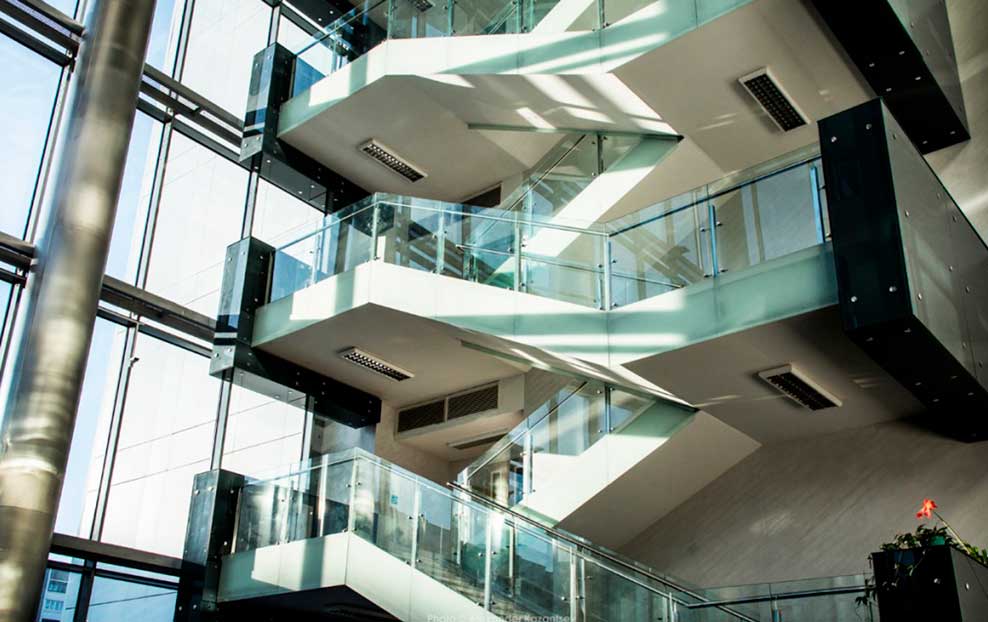У атрыуме размяшчаюцца два панарамныя ліфты і адкрыты лесвічны марш да шостага паверха.
