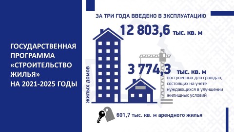 За последние три года введено в эксплуатацию 12 803,6 тыс. кв. м, из которых 3 774,3 тыс. кв. м – для граждан, состоящих на учете нуждающихся в улучшении жилищных условий; 601,7 тыс. кв. м – арендного жилья.