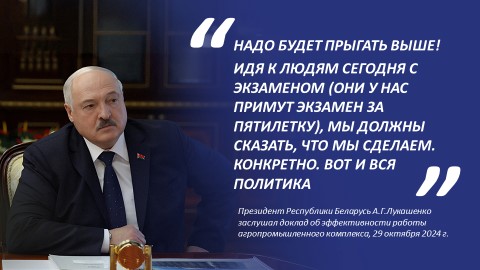 Президент услышал просьбу. Во время доклада об эффективности работы агропромышленного комплекса 29 октября 2024 г. А.Г.Лукашенко озвучил главную задачу и обещание белорусскому народу в предвыборный период: «Надо будет прыгать выше!... Идя к людям сегодня с экзаменом (они у нас примут экзамен за пятилетку), мы должны сказать, что мы сделаем. Конкретно. Вот и вся политика».
