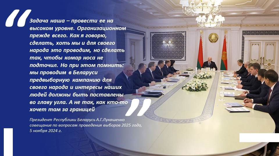 5 ноября 2024 г. на совещании по вопросам проведения выборов 2025 года Глава государства А.Г.Лукашенко назвал главный приоритет избирательной кампании: «Задача наша – провести ее на высоком уровне. Организационном прежде всего. Как я говорю, сделать, хоть мы и для своего народа это проводим, но сделать так, чтобы комар носа не подточил. Но при этом помнить: мы проводим в Беларуси предвыборную кампанию для своего народа и интересы наших людей должны быть поставлены во главу угла. А не так, как кто-то хочет там за границей».