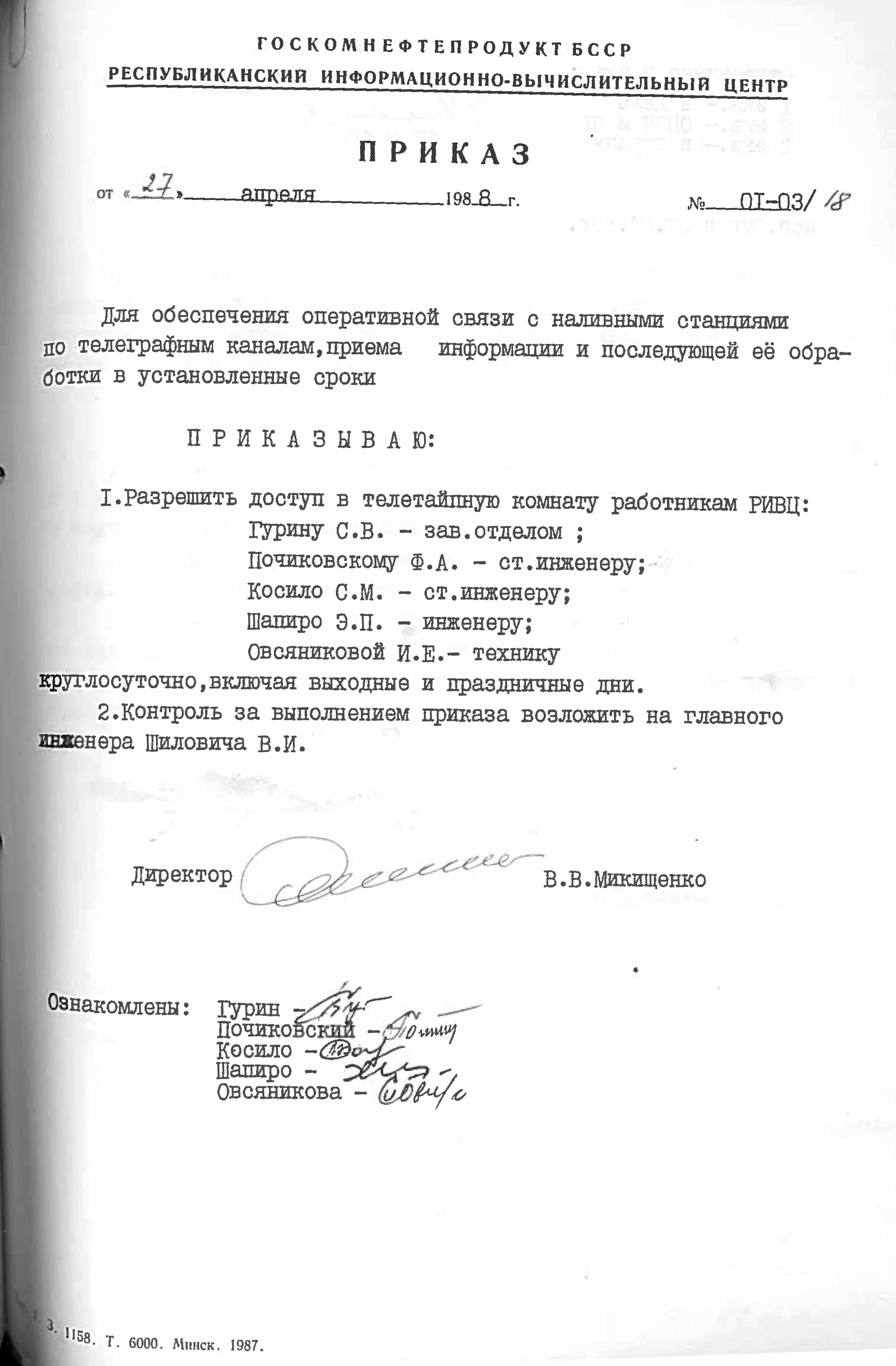 1988 год. В здании РИВЦ имелась телетайпная комната, доступ к которой выдавался с разрешения директора РИВЦ (приказ о доступе в телетайпную комнату).