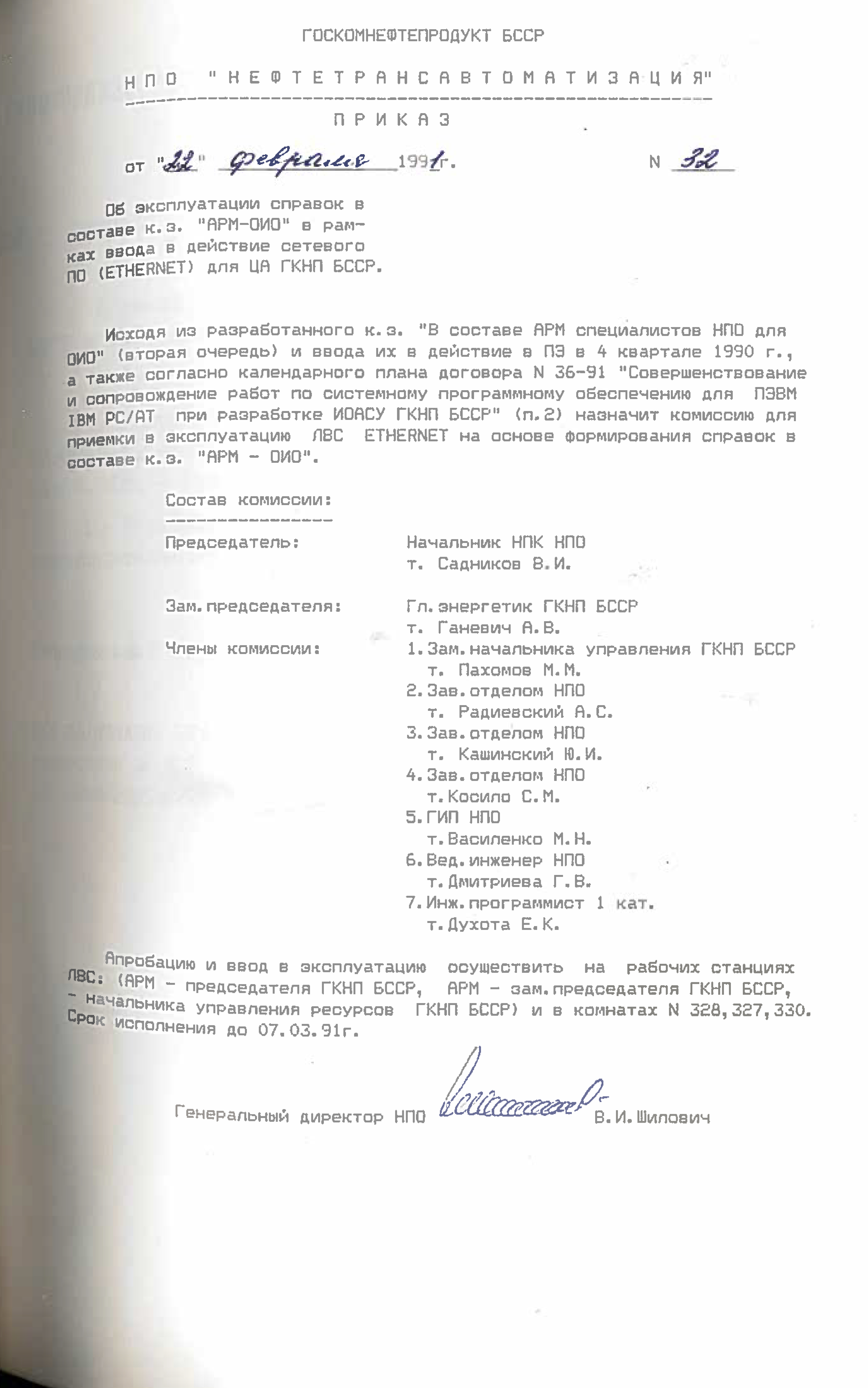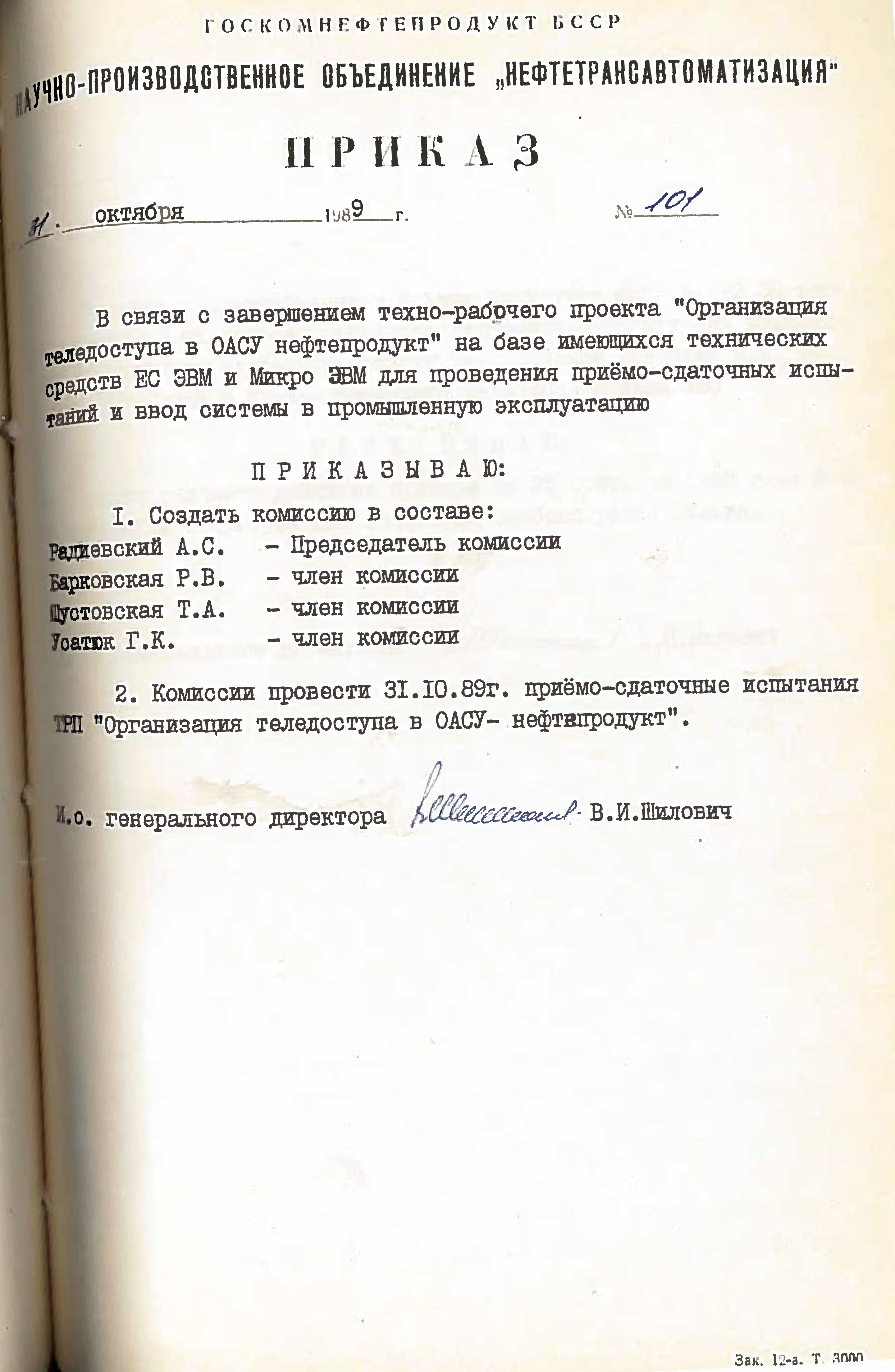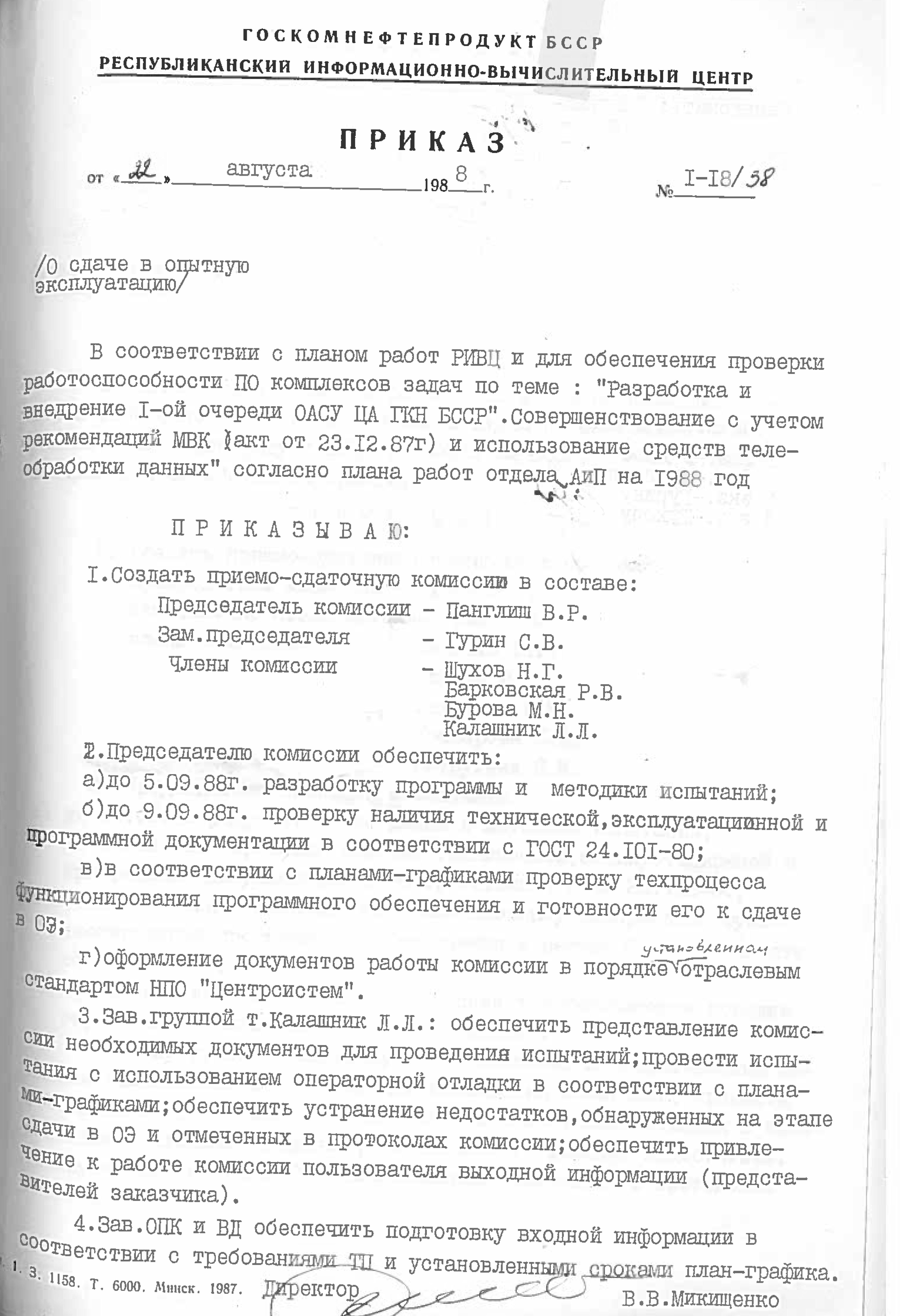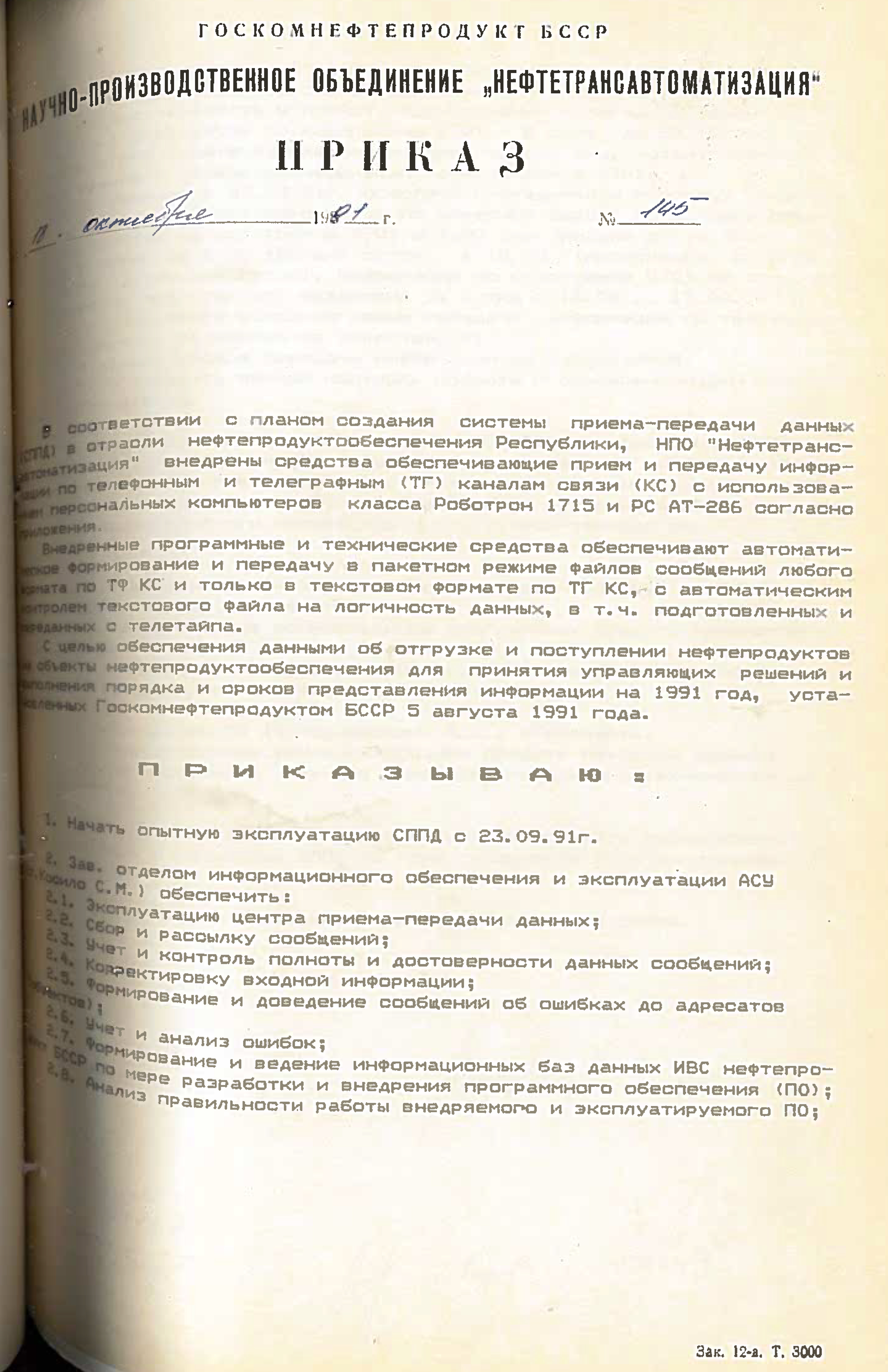 Это решение также подтверждается приказом НПО "Нефтетрансавтоматизации" №4 от 4 ноября 1988 года. Список работников РИВЦ, которые переведены в НПО "Нефтетрансавтоматизация", перечислены в штатном расписании, согласно приказу №3 от 03.11.1998.