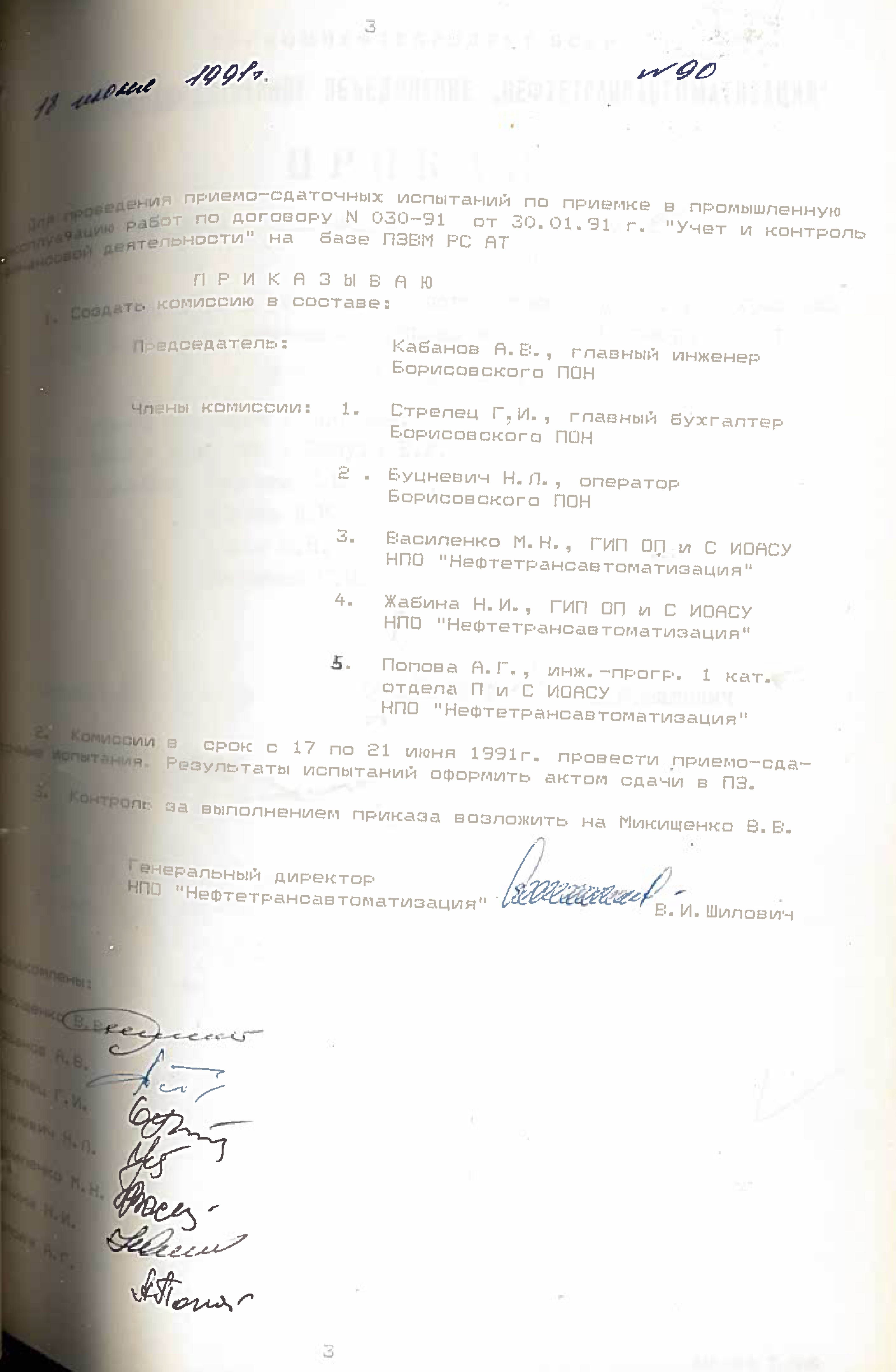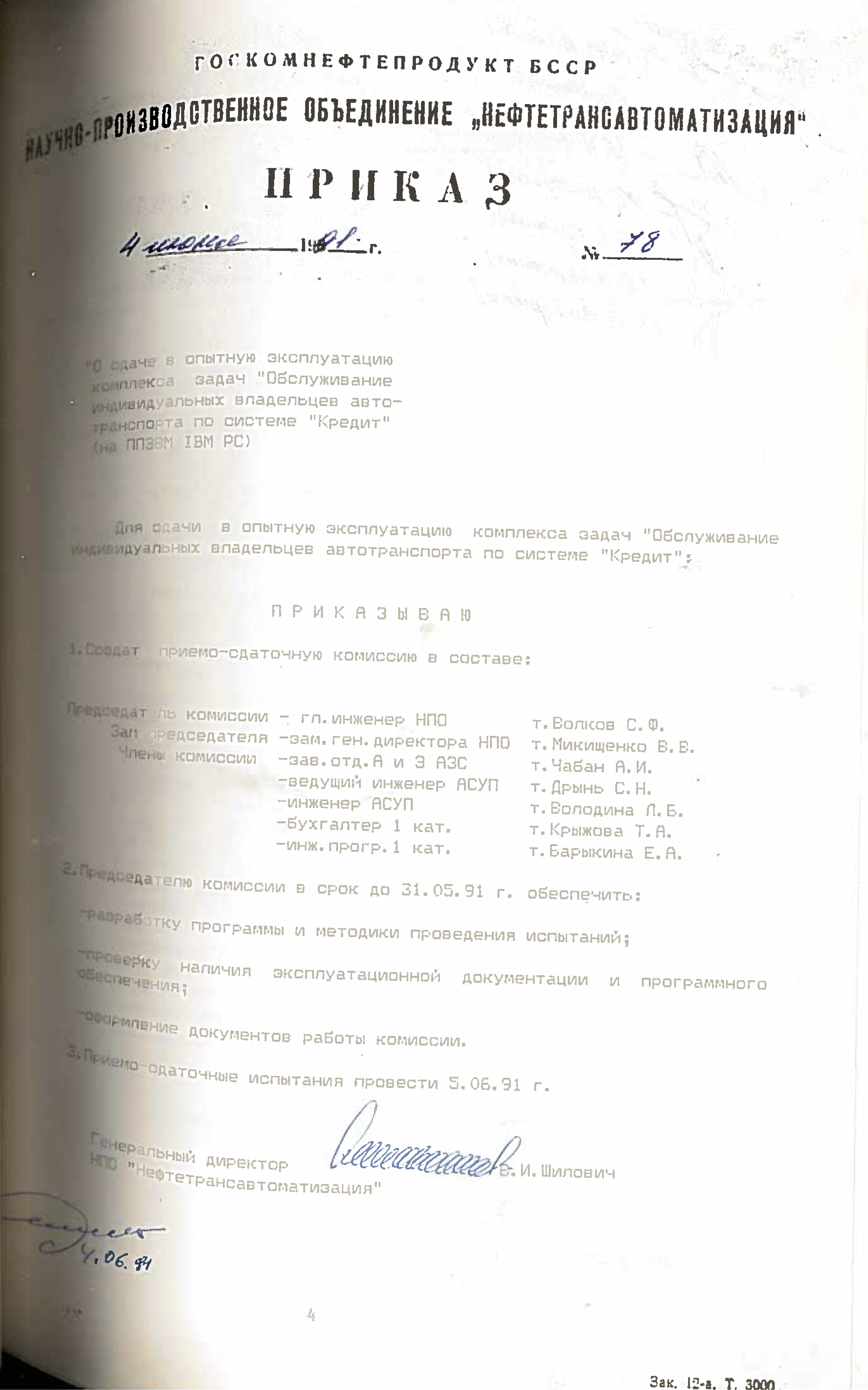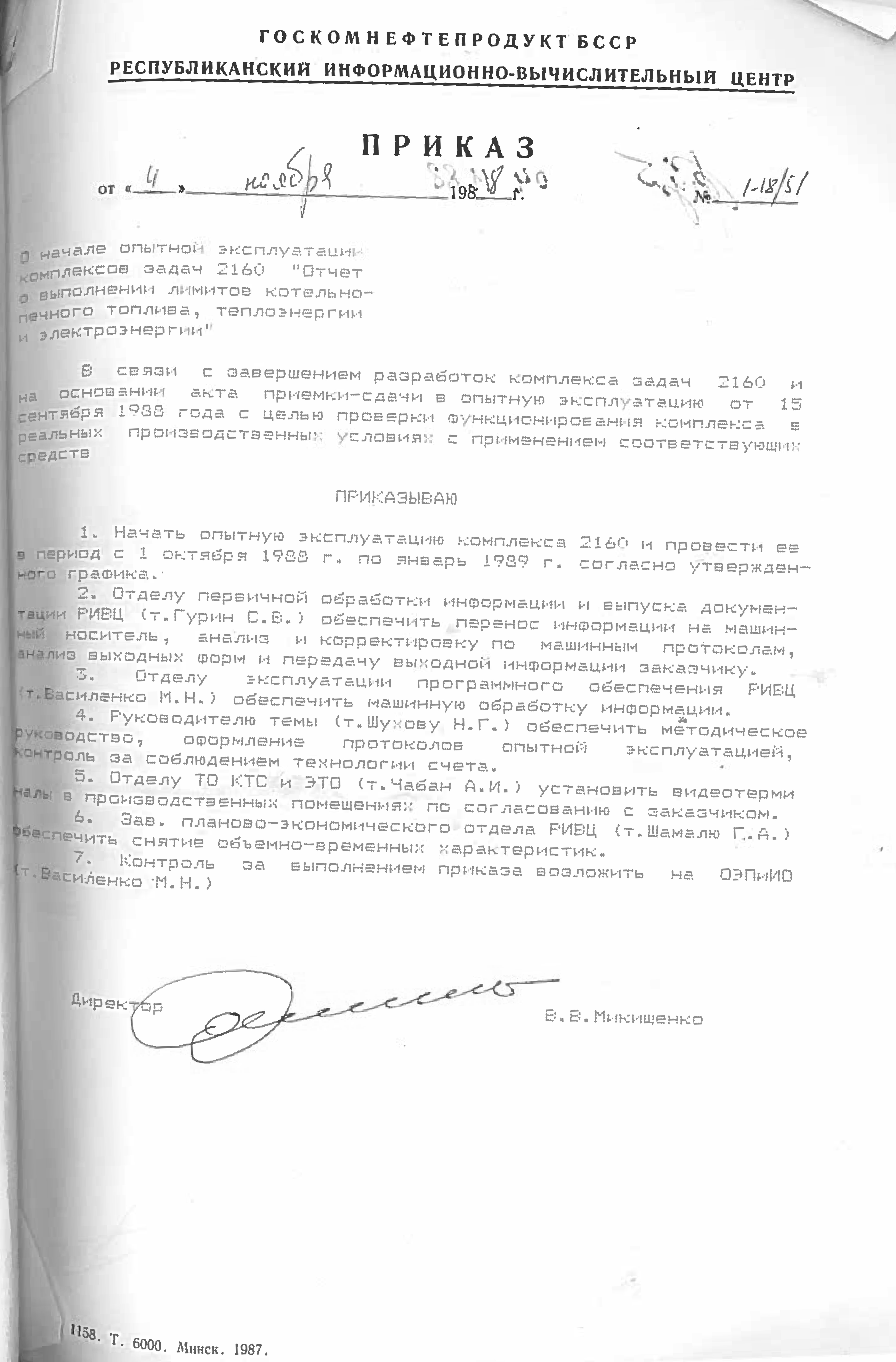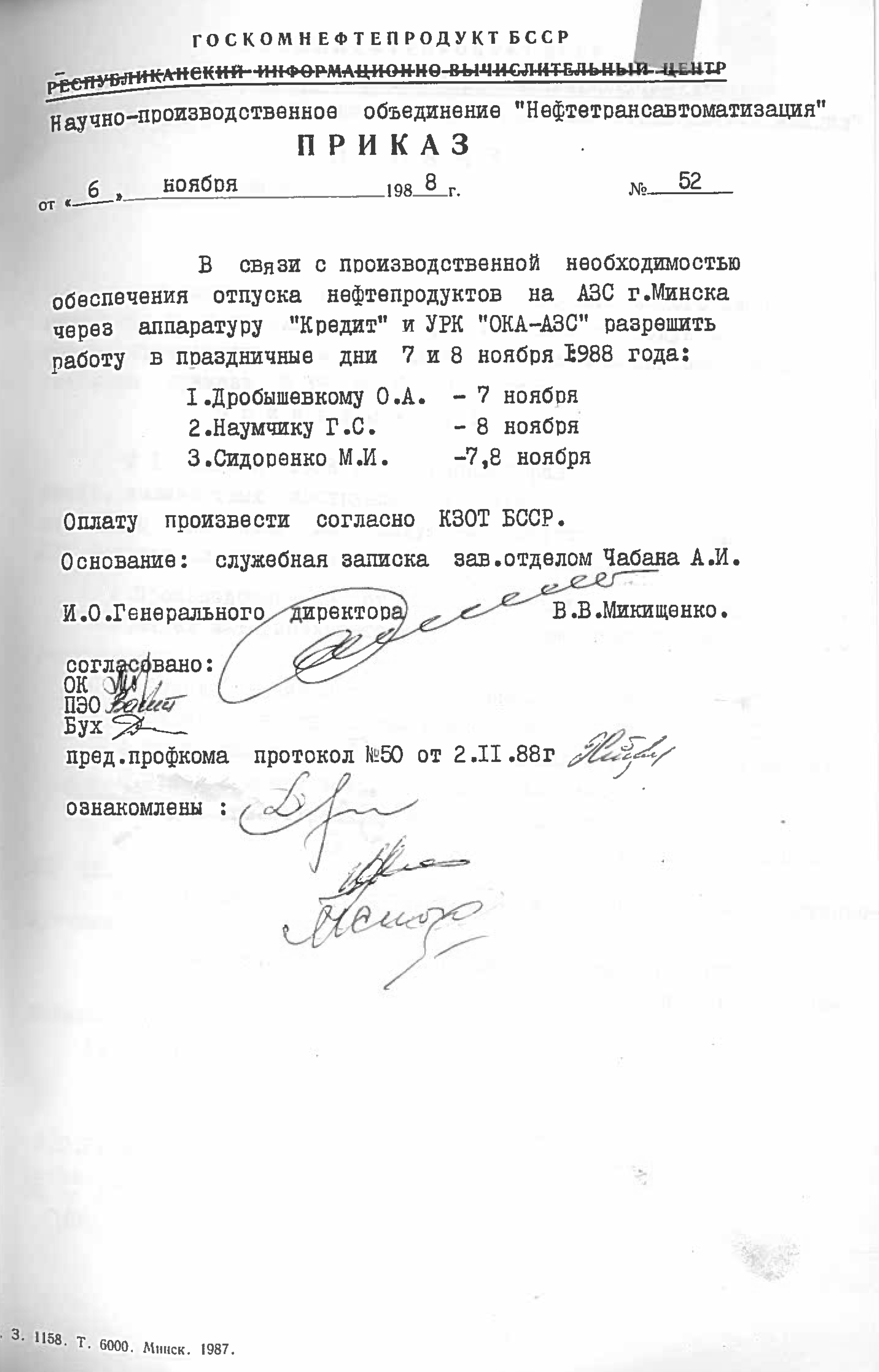 Это решение также подтверждается приказом НПО "Нефтетрансавтоматизации" №4 от 4 ноября 1988 года. Список работников РИВЦ, которые переведены в НПО "Нефтетрансавтоматизация", перечислены в штатном расписании, согласно приказу №3 от 03.11.1998.