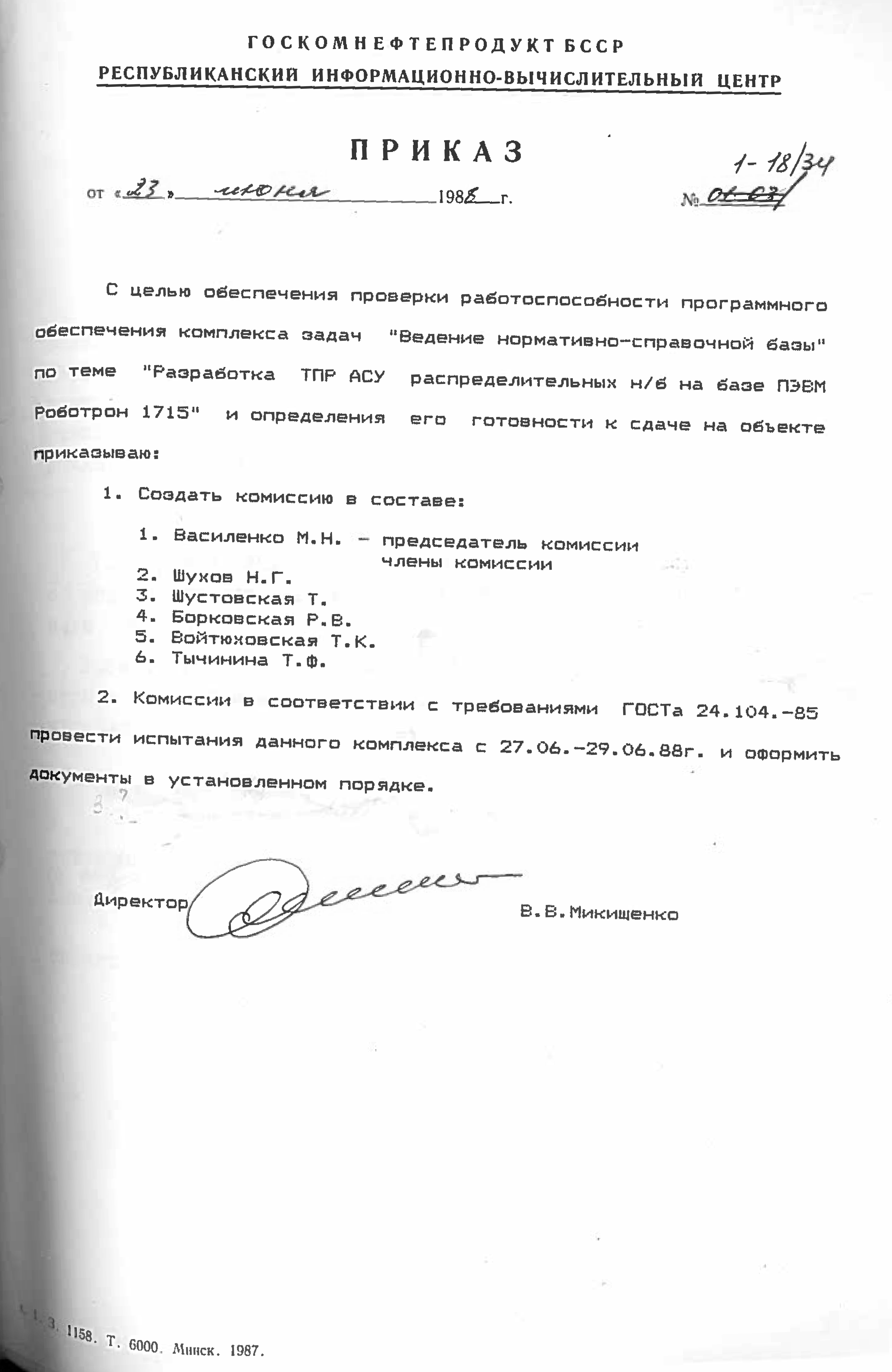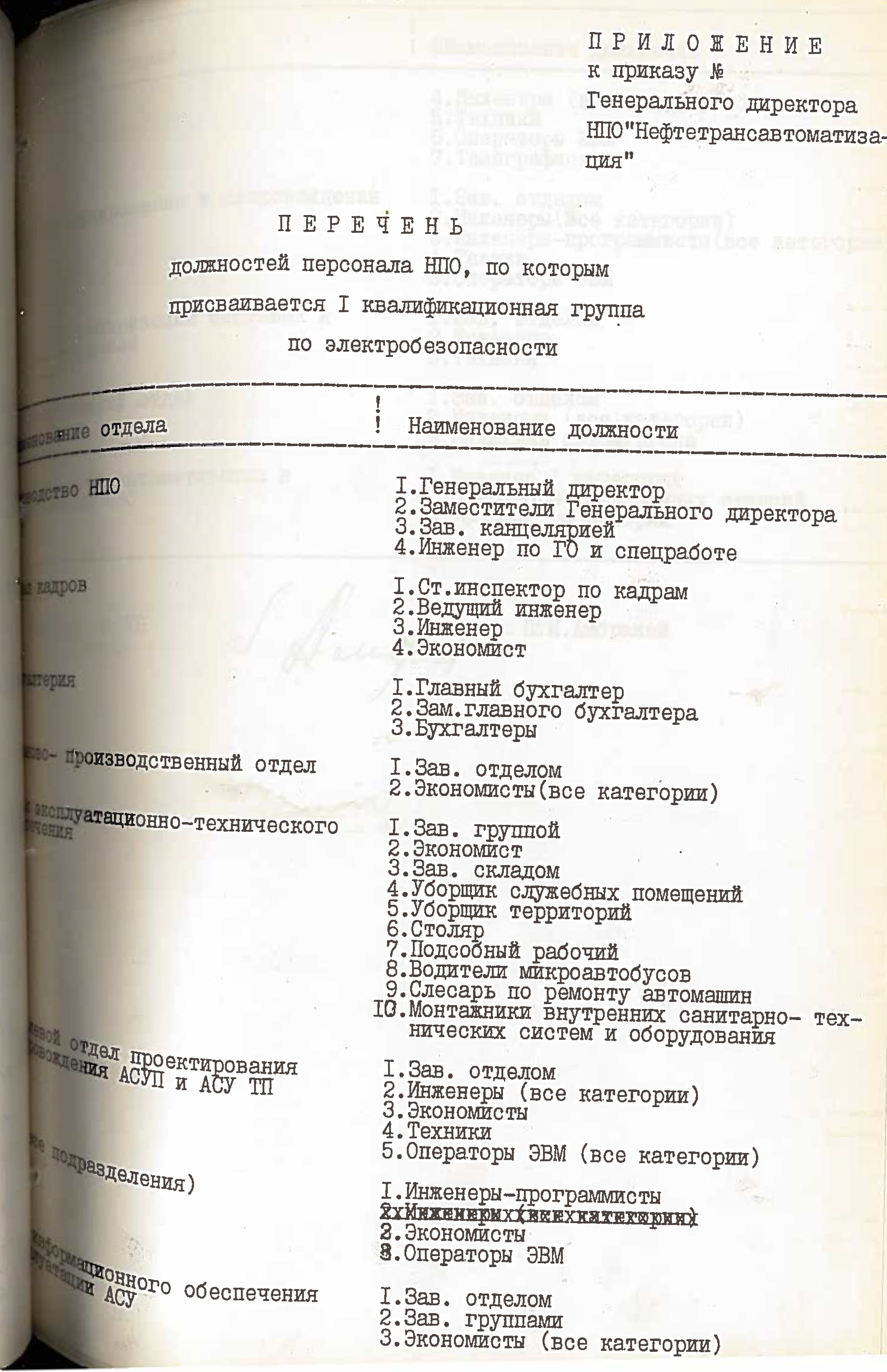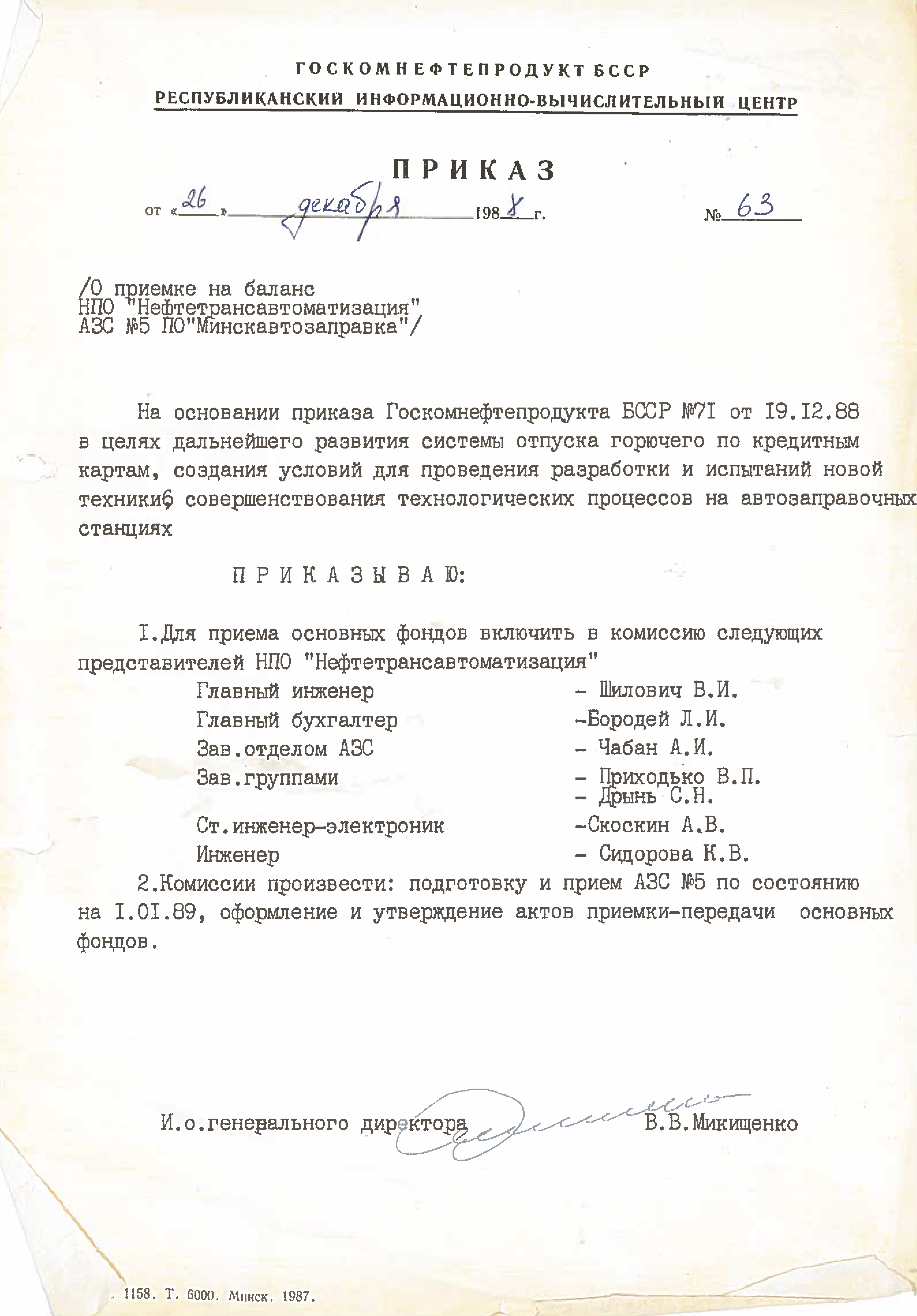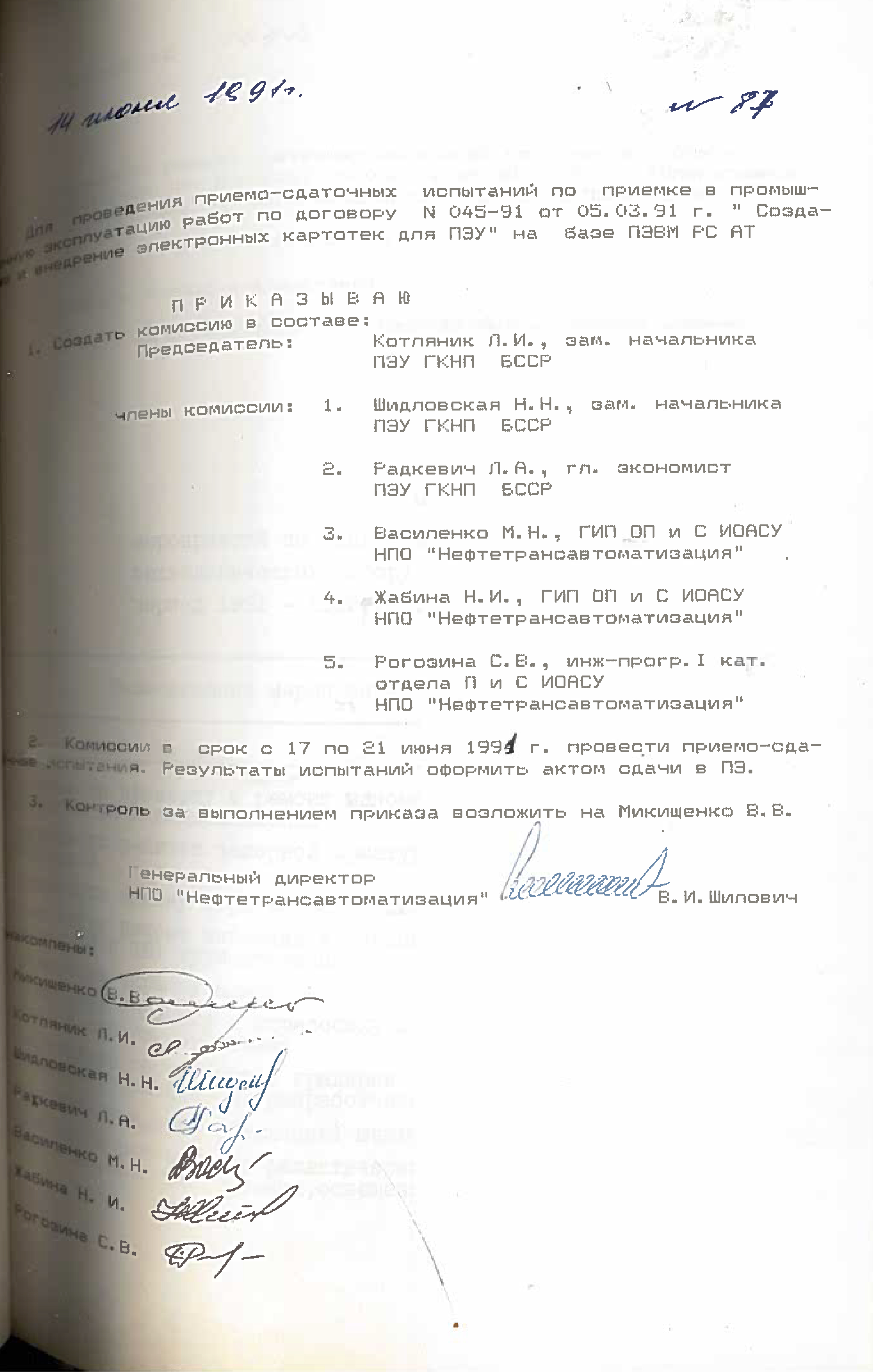 Это решение также подтверждается приказом НПО "Нефтетрансавтоматизации" №4 от 4 ноября 1988 года. Список работников РИВЦ, которые переведены в НПО "Нефтетрансавтоматизация", перечислены в штатном расписании, согласно приказу №3 от 03.11.1998.