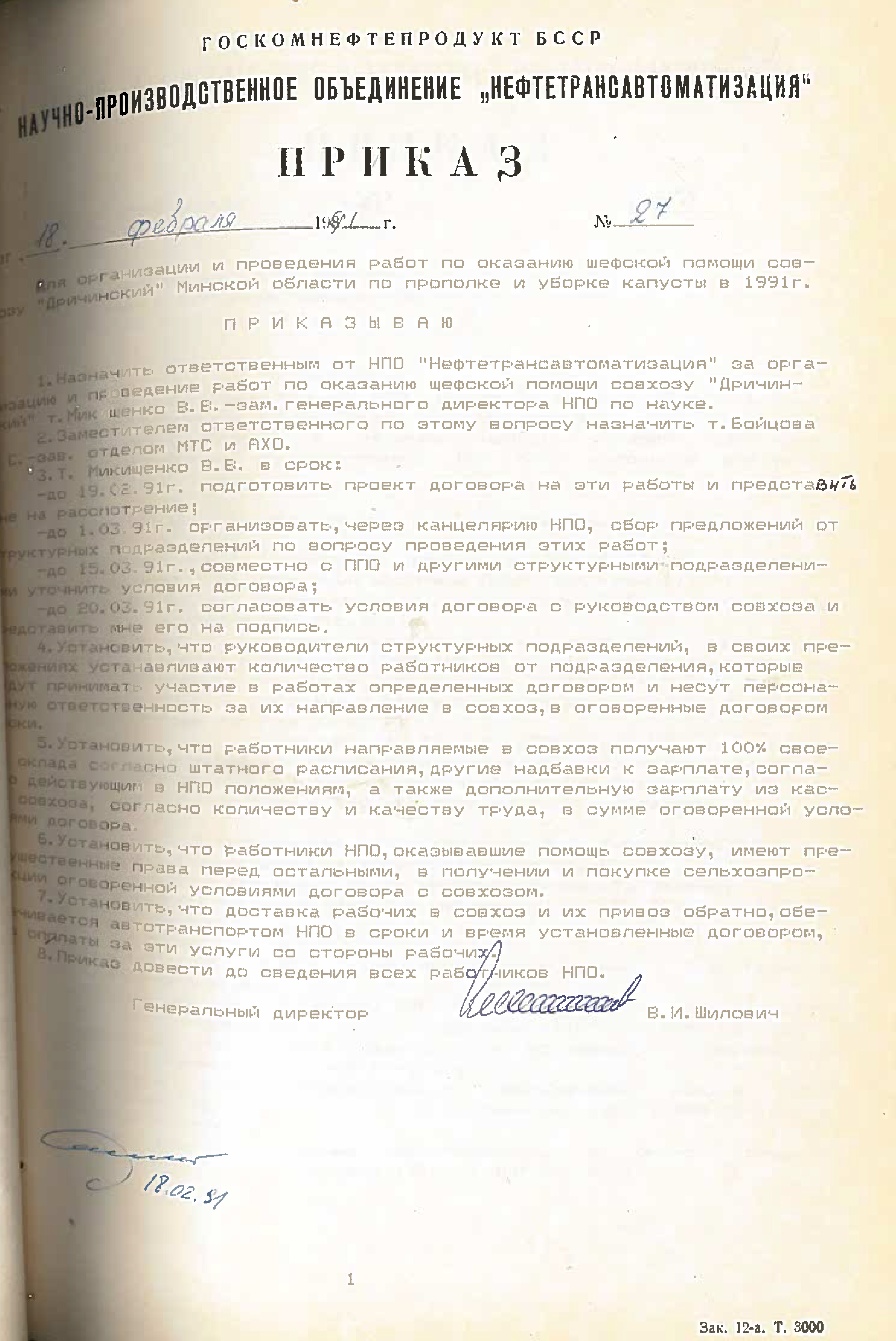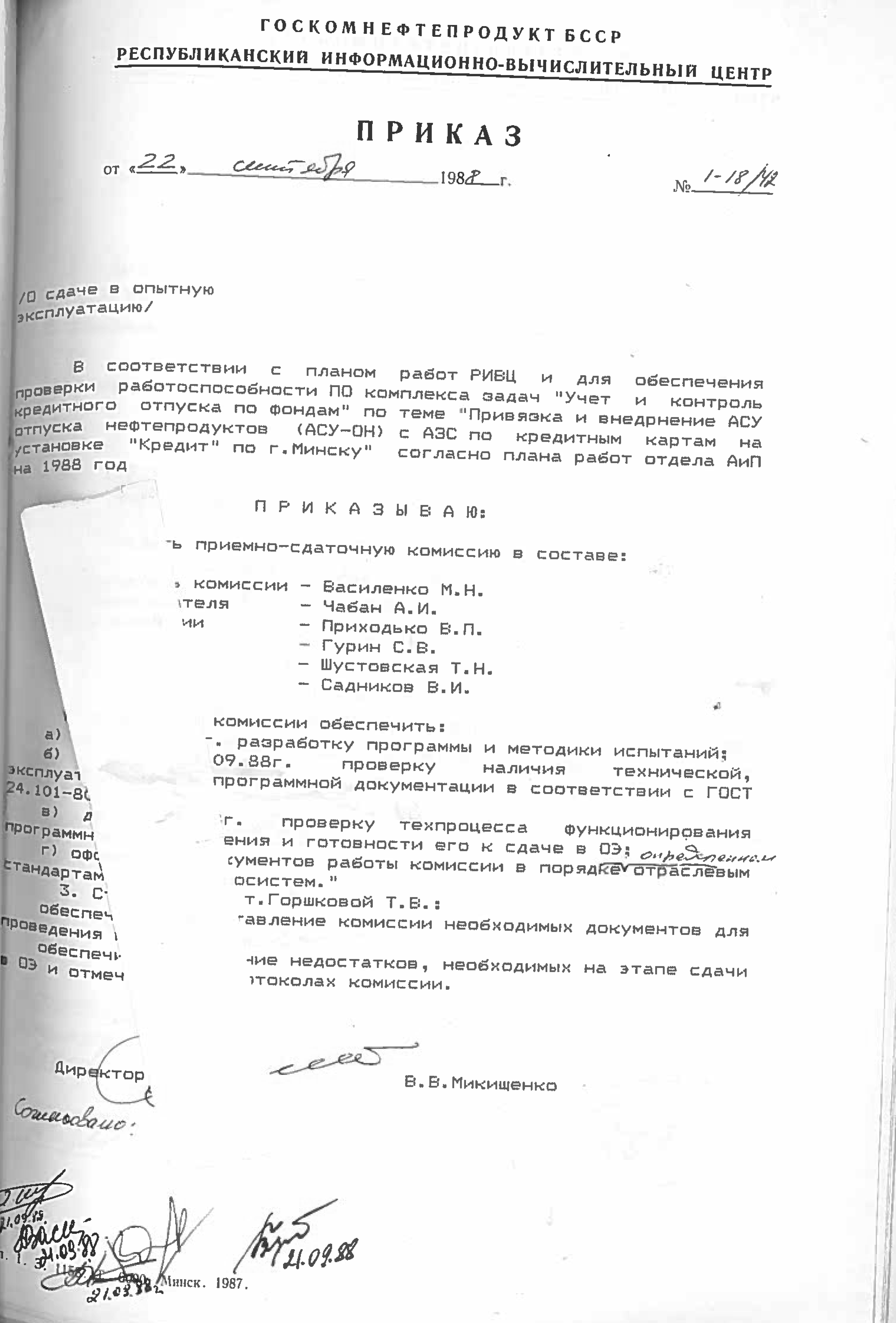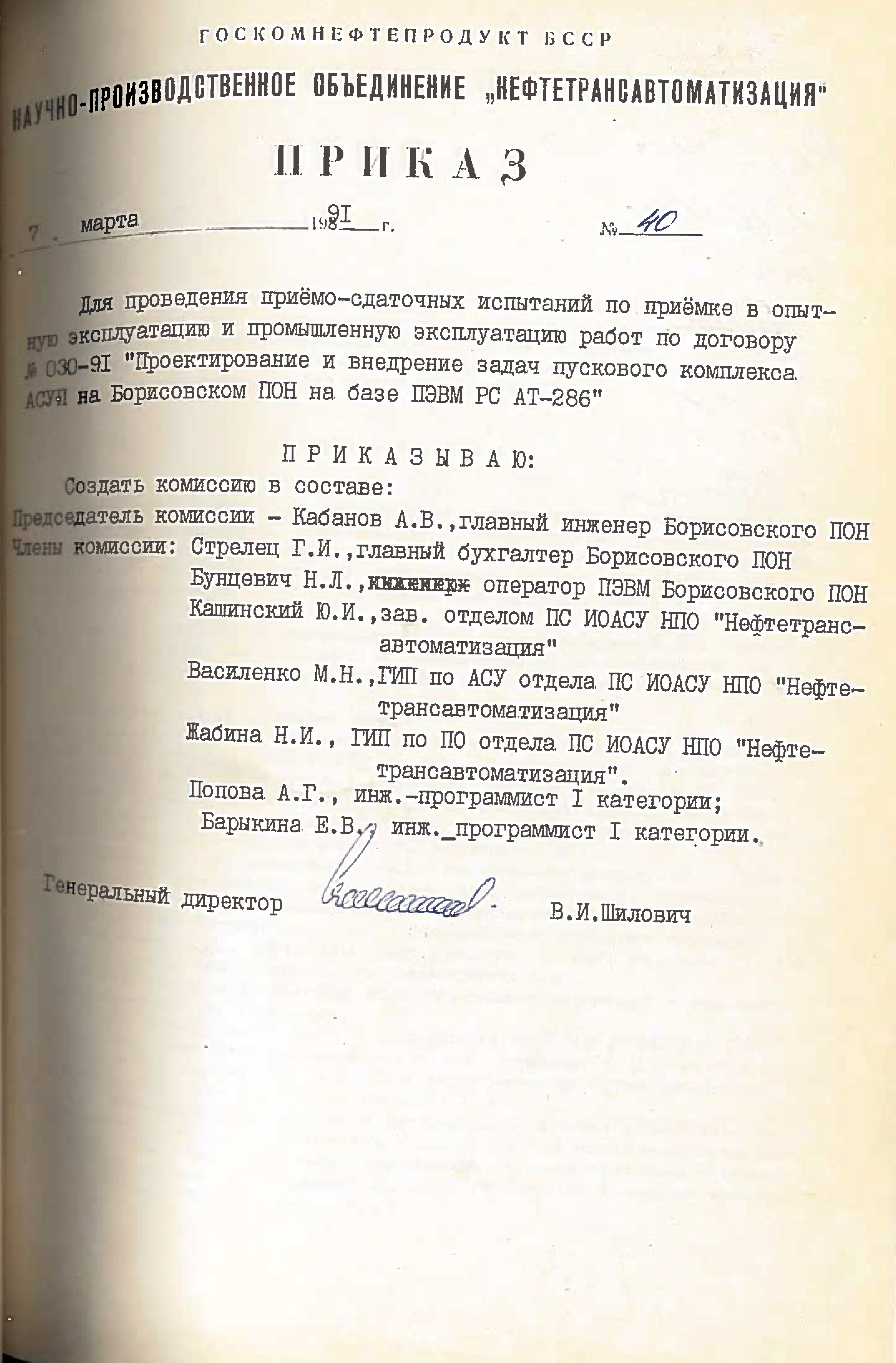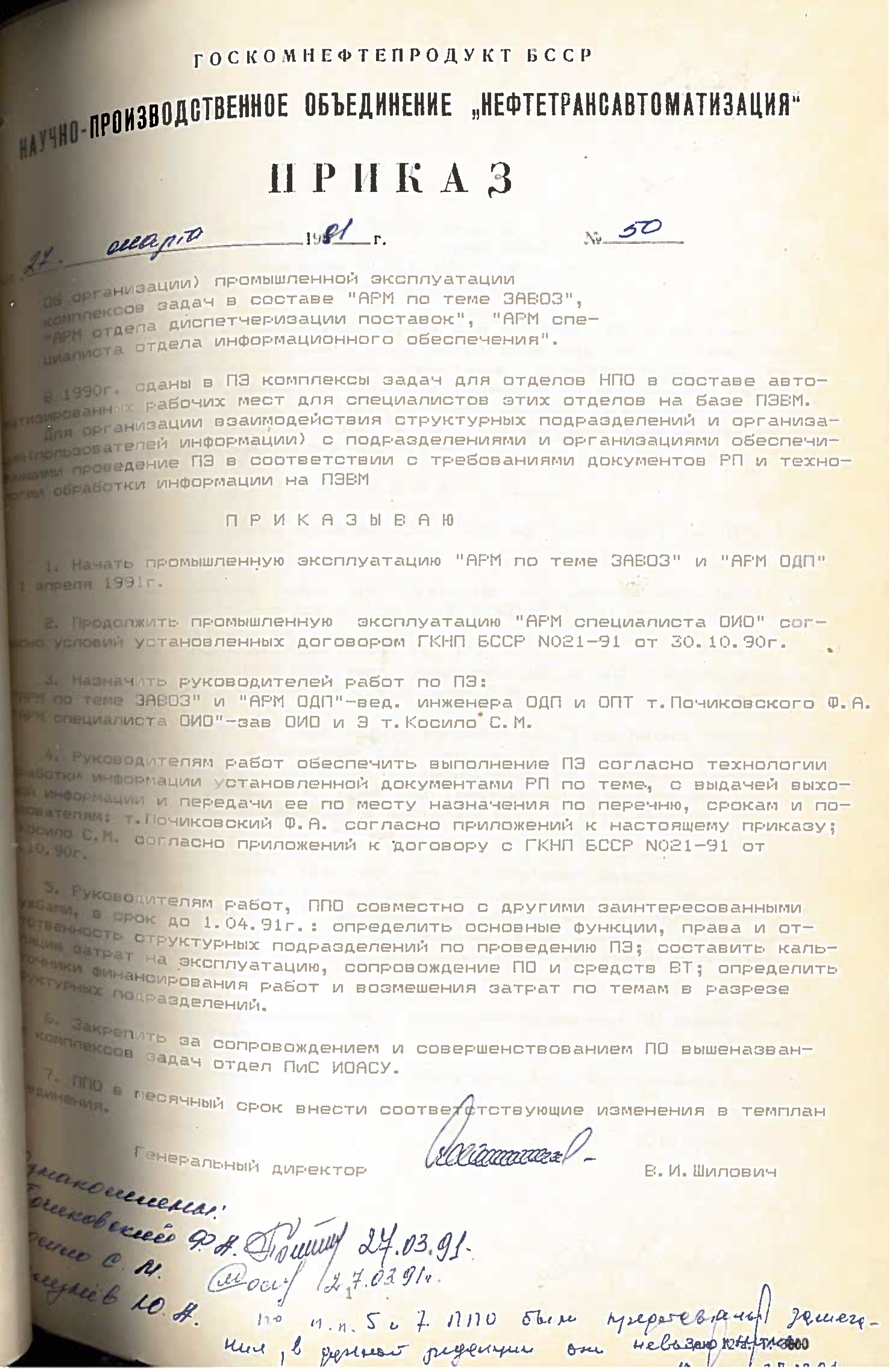 - “Привязка и внедрение АСУП нефтерподукт ПОН, ПО Брестоблнефтепродукт, Гроднооблнефтепродукт и Гомельоблнефтепродукт - ведущий инженер т.Минченко В.П., при этом эти обязанности сняты с зав. отделом т.Кашинского Ю.И. и зам. зав. отделом т.Селянского А.В.