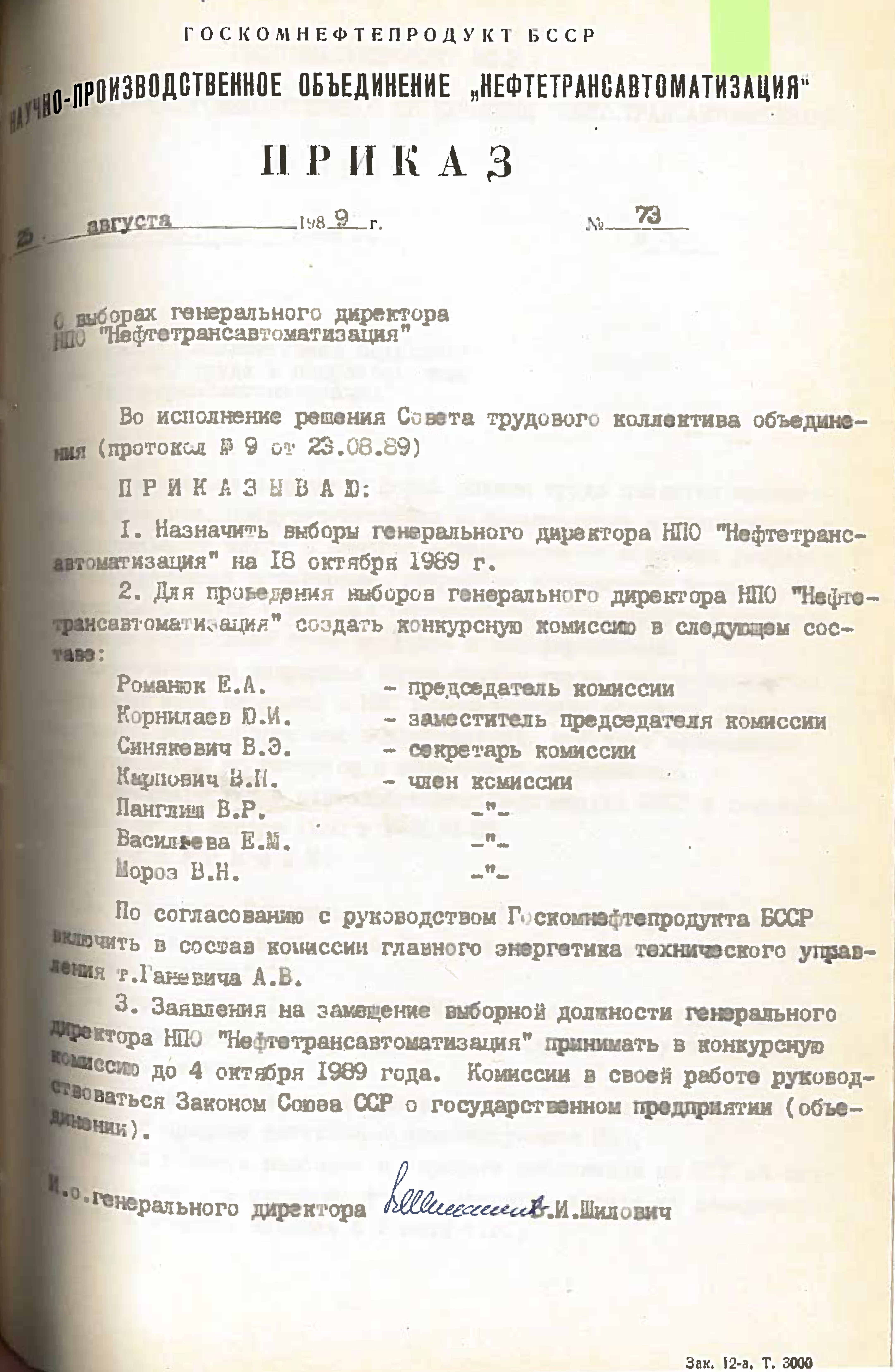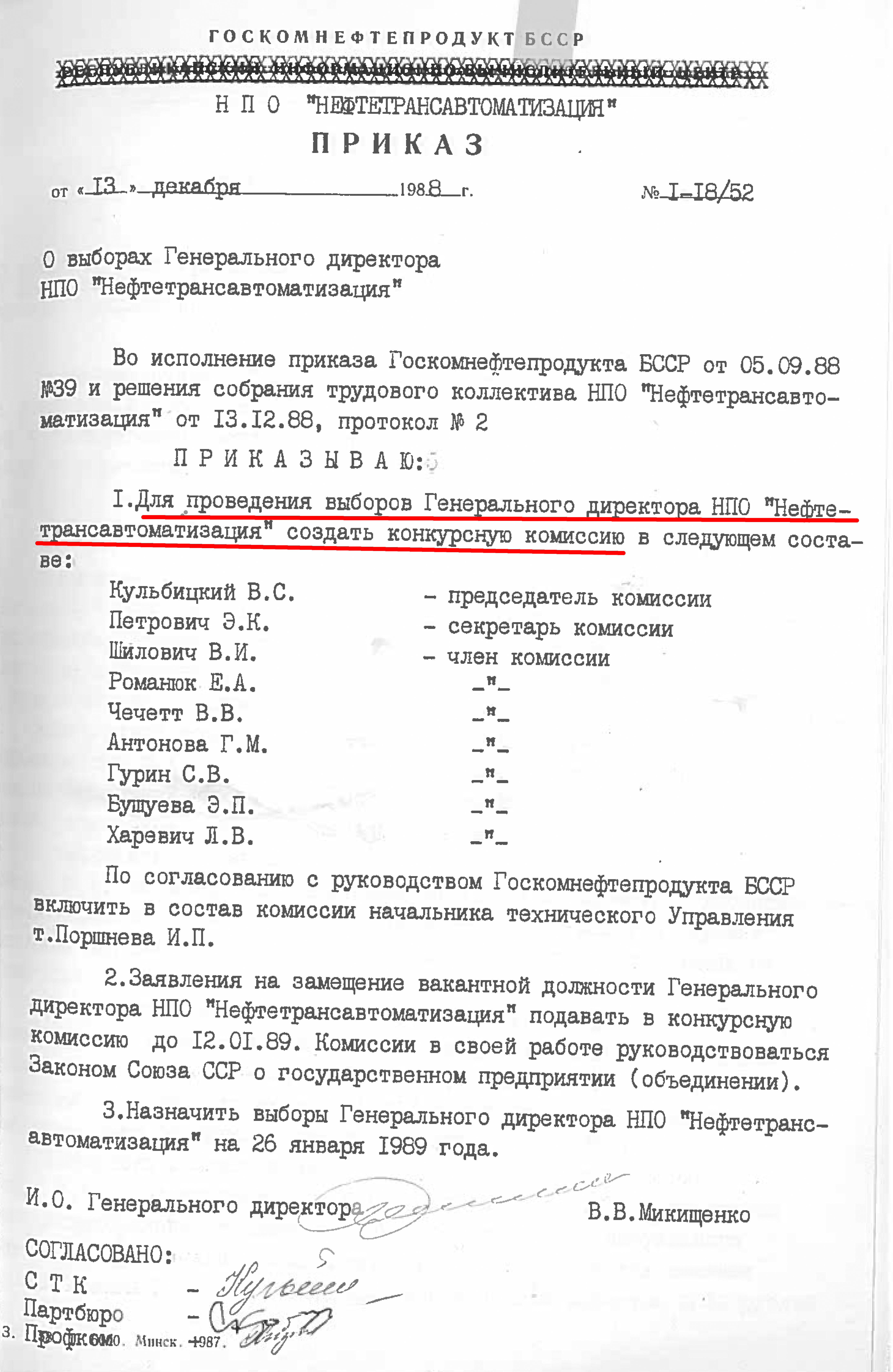 13 декабря 1988 года назначались выборы Генерального директора НПО «Нефтетрансавтоматизация». Была создана конкурсная комиссия, которая принимала заявления на замещение вакантной должности Генерального директора и назначала выборы (приказ №1-18/52 от 13.12.1988). Выборы генерального директора изначально назначены на 18 октября 1989, но позже выбрана другая дата - 26 января 1989 года (согласно приказу №73 от 25.08.1989 года):