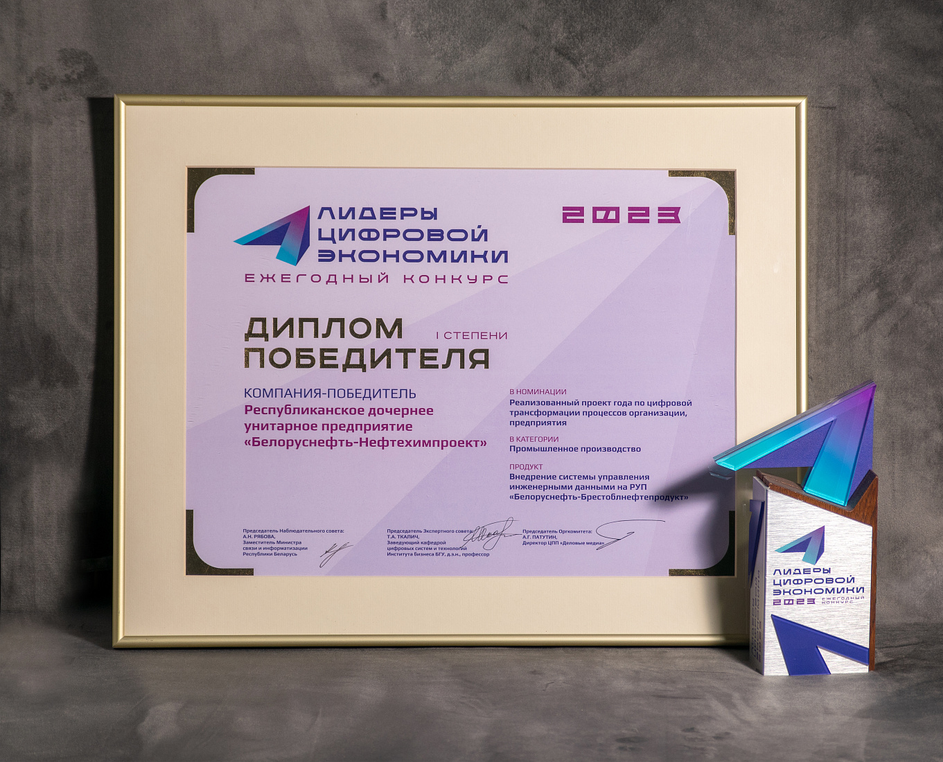 Диплом победителя I степени в ежегодном конкурсе «Лидеры цифровой экономики-2023» в номинации «Реализованный проект года по цифровой трансформации процессов организации, предприятия» в категории «Промышленное производство» с продуктом «Внедрение системы управления инженерными данными на РУП «Белоруснефть-Брестоблнефтепродукт».