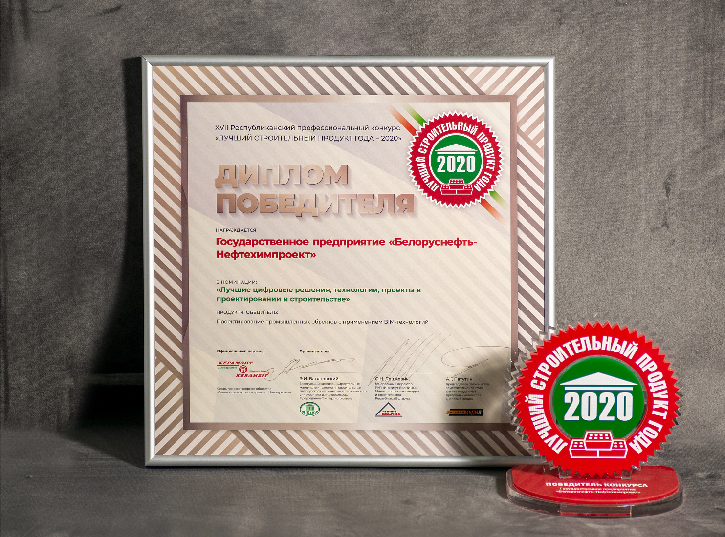Государственному предприятию "Белоруснефть-Нефтехимпроект" присужден Диплом победителя в конкурсе "Лучший строительный продукт года - 2020" в номинации "Лучшие цифровые решения, технологии, проекты в проектировании и строительстве".