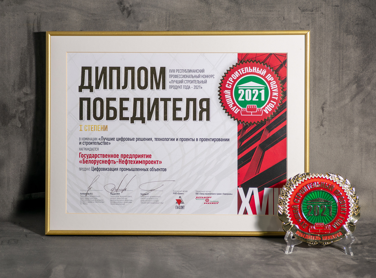 В XVIII Республиканском профессиональном конкурсе «Лучший строительный продукт года – 2021» государственное предприятие «Белоруснефть-Нефтехимпроект» стало победителем в номинации «Лучшие цифровые решения, технологии и проекты в проектировании и строительстве» (продукт «Цифровизация промышленных объектов») и получило Диплом I степени и памятный знак победителя.