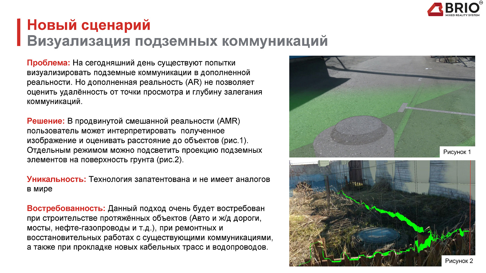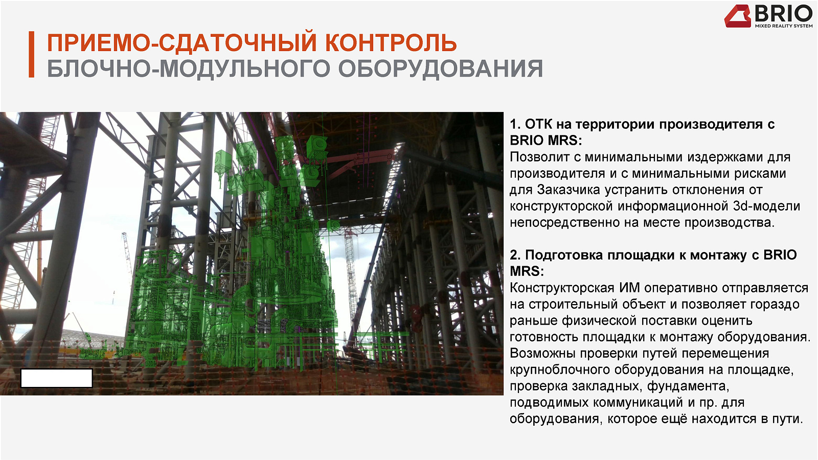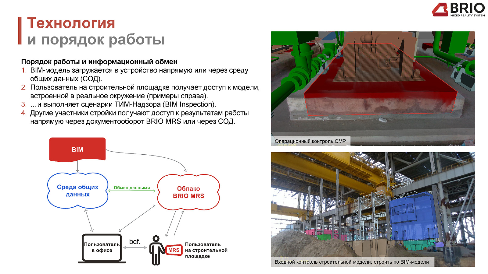Устройство БРИО МРС работает на базе очков смешанной реальности (аналог Microsoft HoloLens), но адаптировано под специфику строительства и имеет специализированное программное обеспечение , ориентированное на российские стандарты и проектирование.