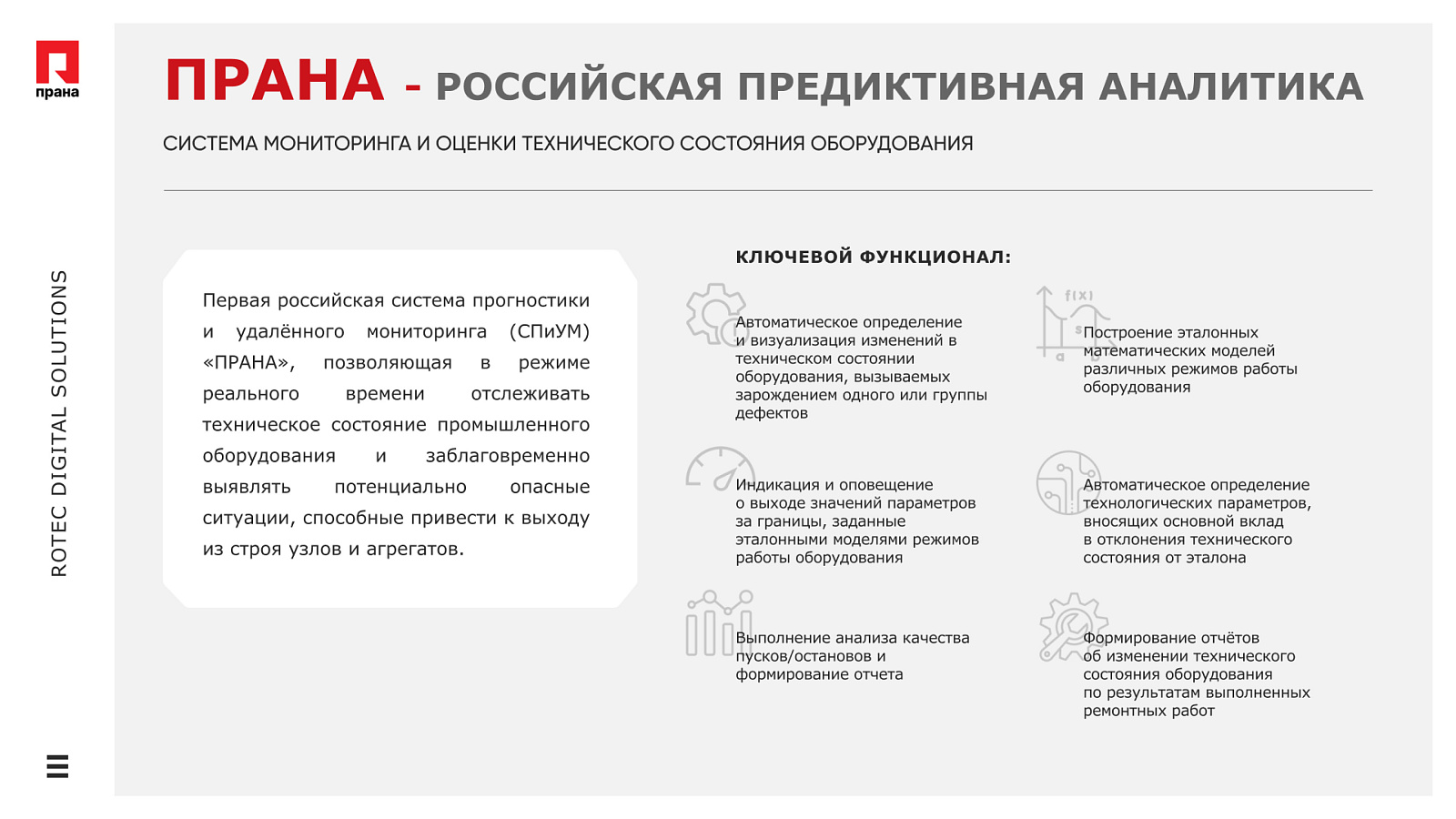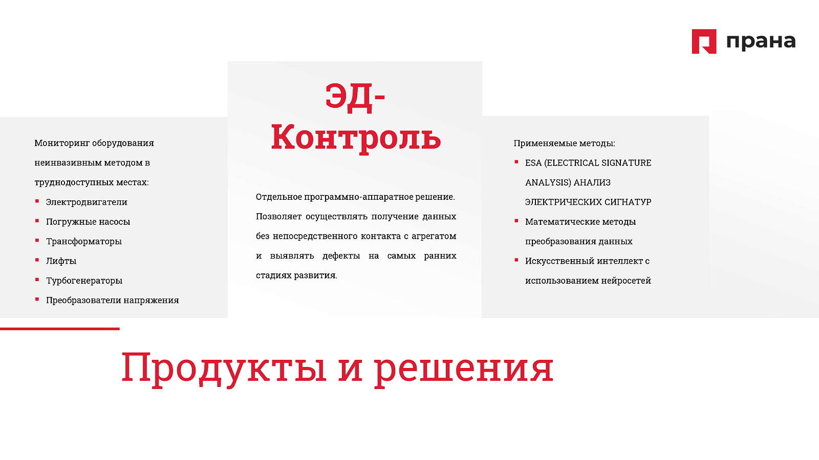 Флагманский продукт компании — система предиктивной аналитики ПРАНА — это промышленное решение на основе технологии многомерных векторных статистических моделей (МВСМ), разработанное специально для условий повышенной опасности, включая атомную энергетику. ПРАНА обеспечивает раннюю диагностику отклонений в работе оборудования — задолго до возникновения аварии, что позволяет перевести обслуживание из реактивного режима в проактивный.