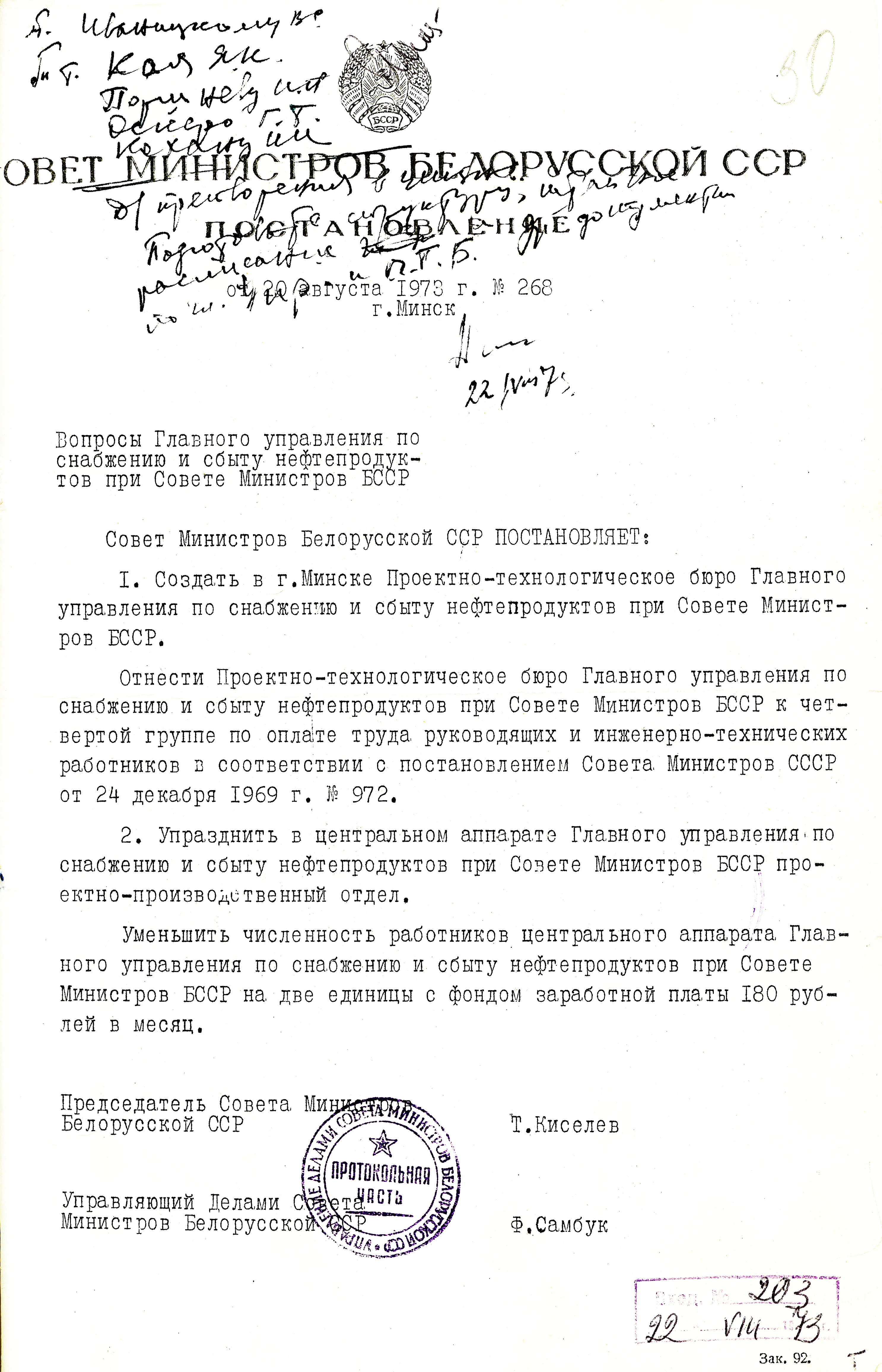 Пастановай Савета Міністраў БССР ад 20.08.1973 №268 было створана ў г.Мінску Праектна-тэхналагічнае бюро Галоўнага ўпраўлення па забеспячэнні і збыце нафтапрадуктаў пры Савеце Міністраў БССР (ПТБ БДНСС БССР) з рэзалюцыяй "Для ажыццяўлення".
