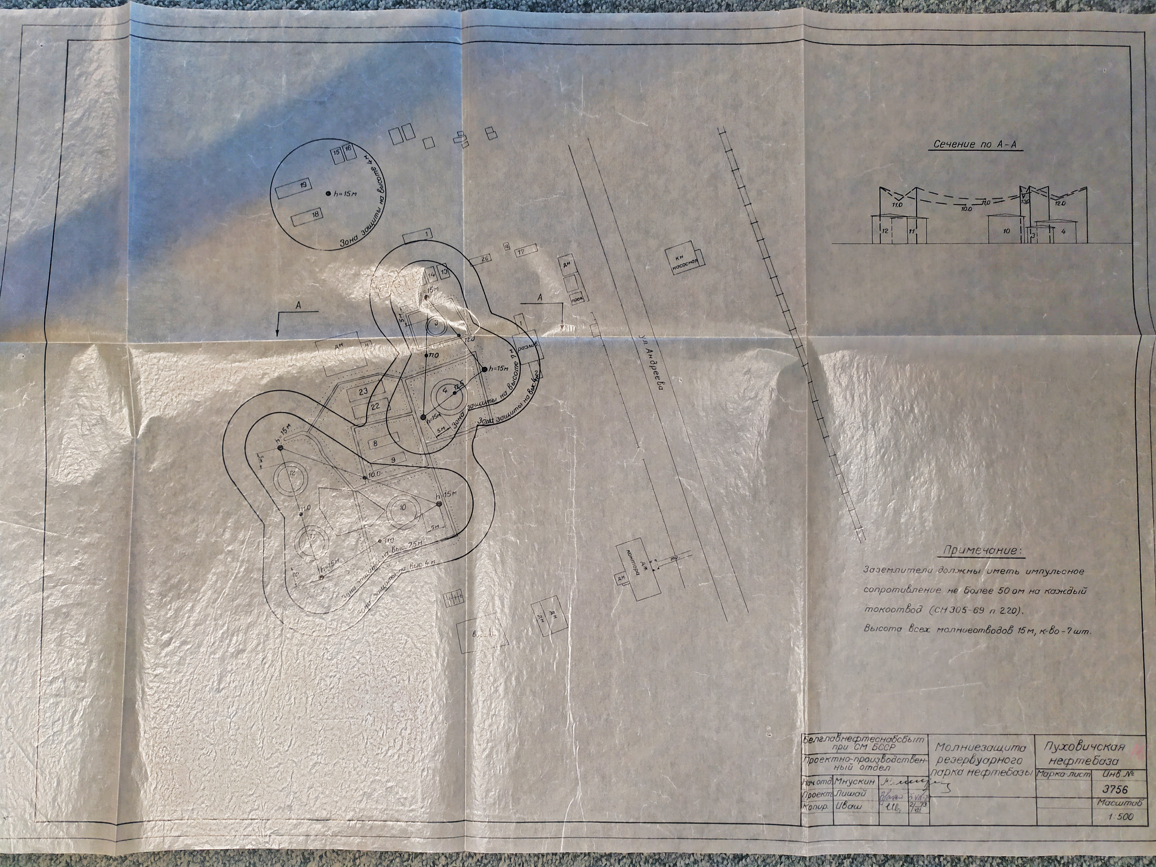 Фрагмент калькі чарцяжа маланкаабароны Пухавіцкай нафтабазы 1973 года: