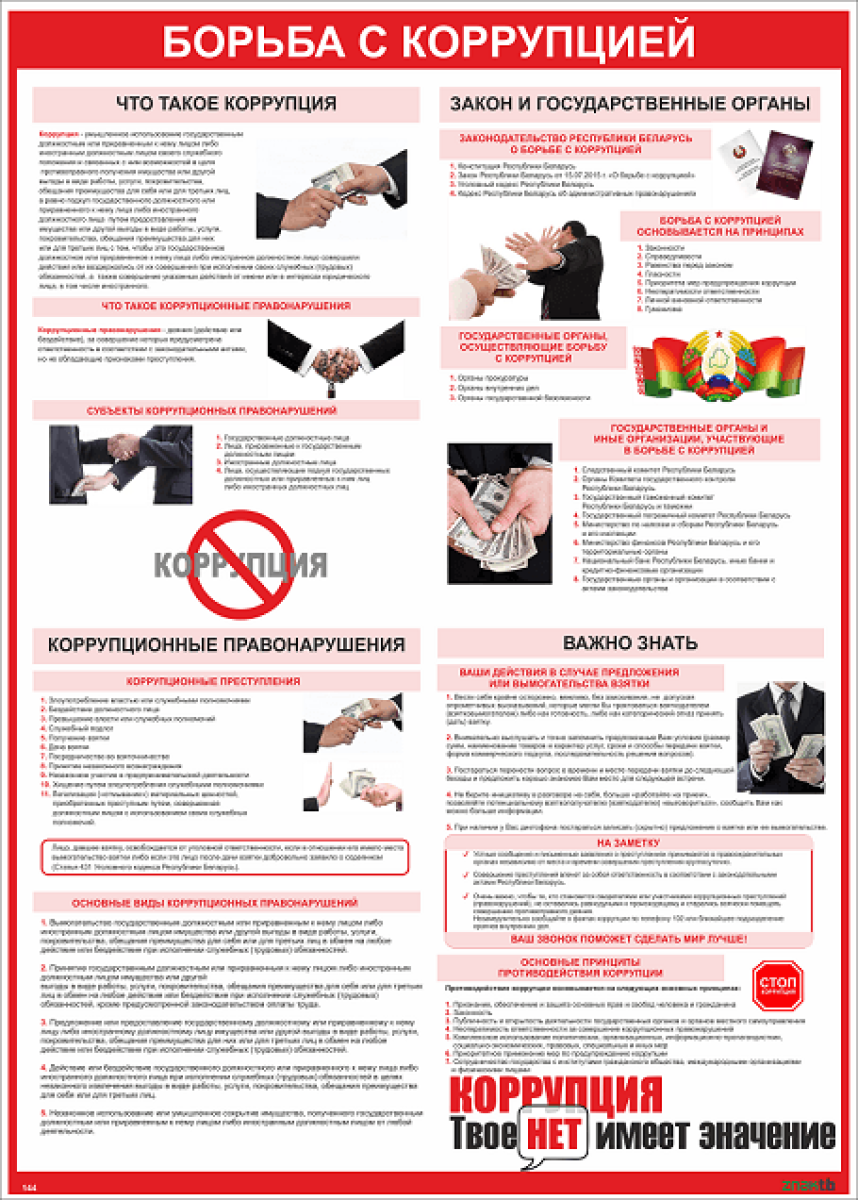 1 В соответствии со статьей 1 Закона Республики Беларусь от 15.07.2015 № 305-З «О борьбе коррупцией», коррупция – умышленное использование государственным должностным или приравненным к нему лицом своего служебного положения и связанных с ним возможностей в целях противоправного получения имущества или другой выгоды в виде работы, услуги, покровительства, обещания преимущества для себя или для третьих лиц, а равно подкуп должностного или приравненного к нему лица путем предоставления им имущества или другой выгоды виде работы, услуги, покровительства, обещания преимущества для них или для третьих лиц с тем, чтобы это должностное или приравненное к нему лицо совершили действия или воздержались от их совершения при исполнении своих служебных (трудовых) обязанностей, а также совершение указанных действий от имени или в интересах юридического лица, в том числе иностранного.