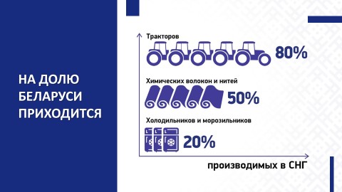 На долю Беларуси приходится около 80% производимых в СНГ тракторов, около 50% химических волокон и нитей, пятая часть холодильников и морозильников.