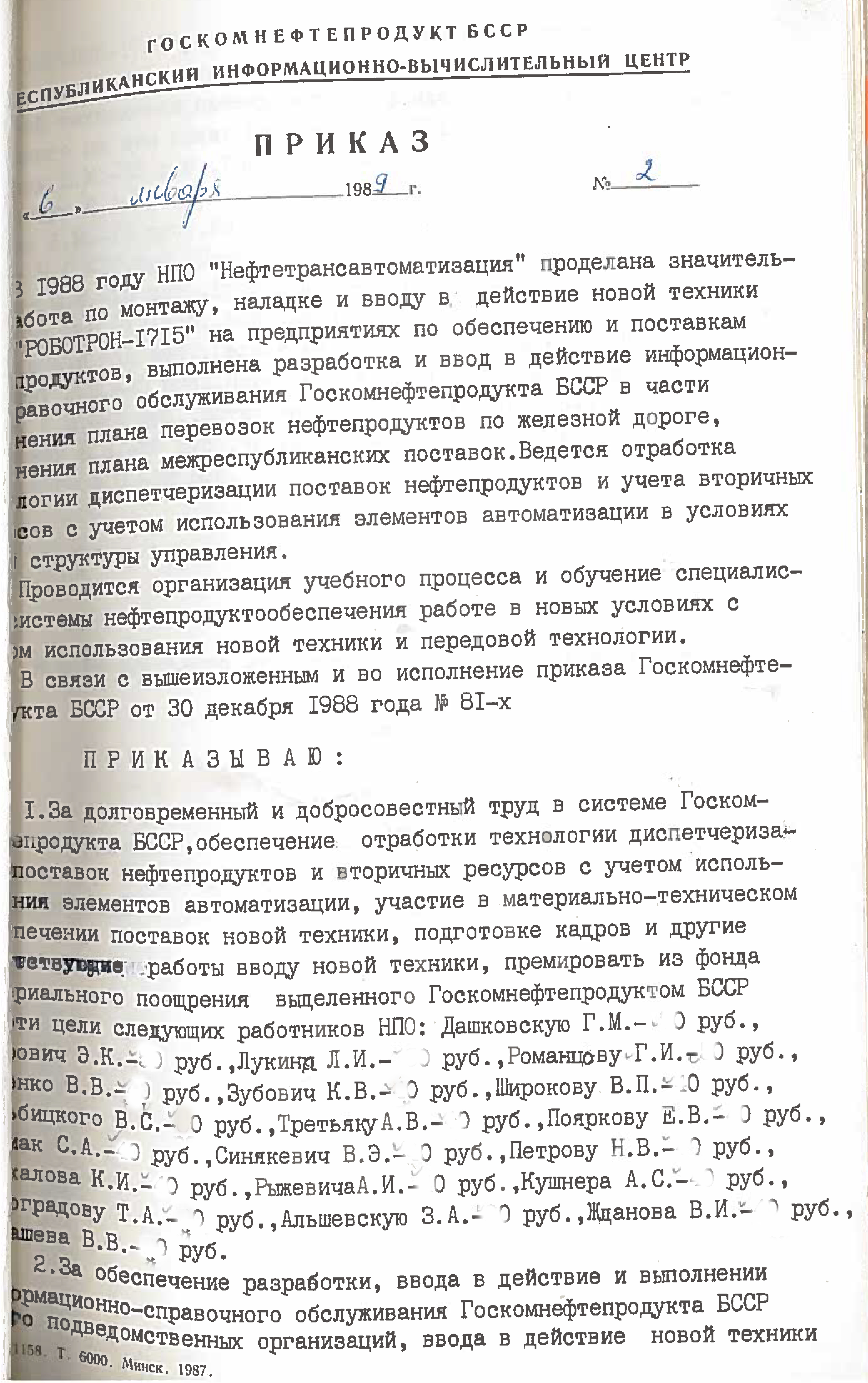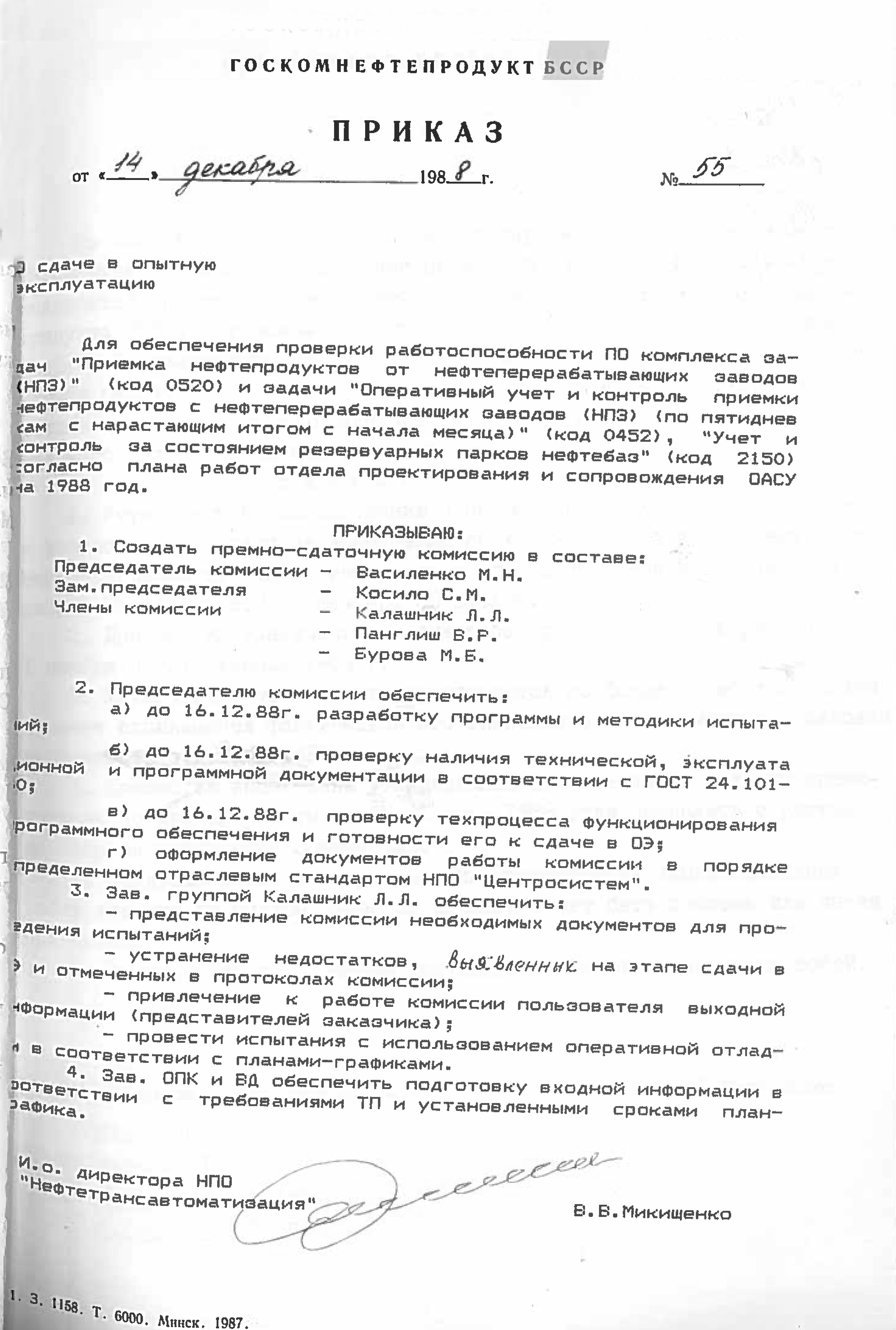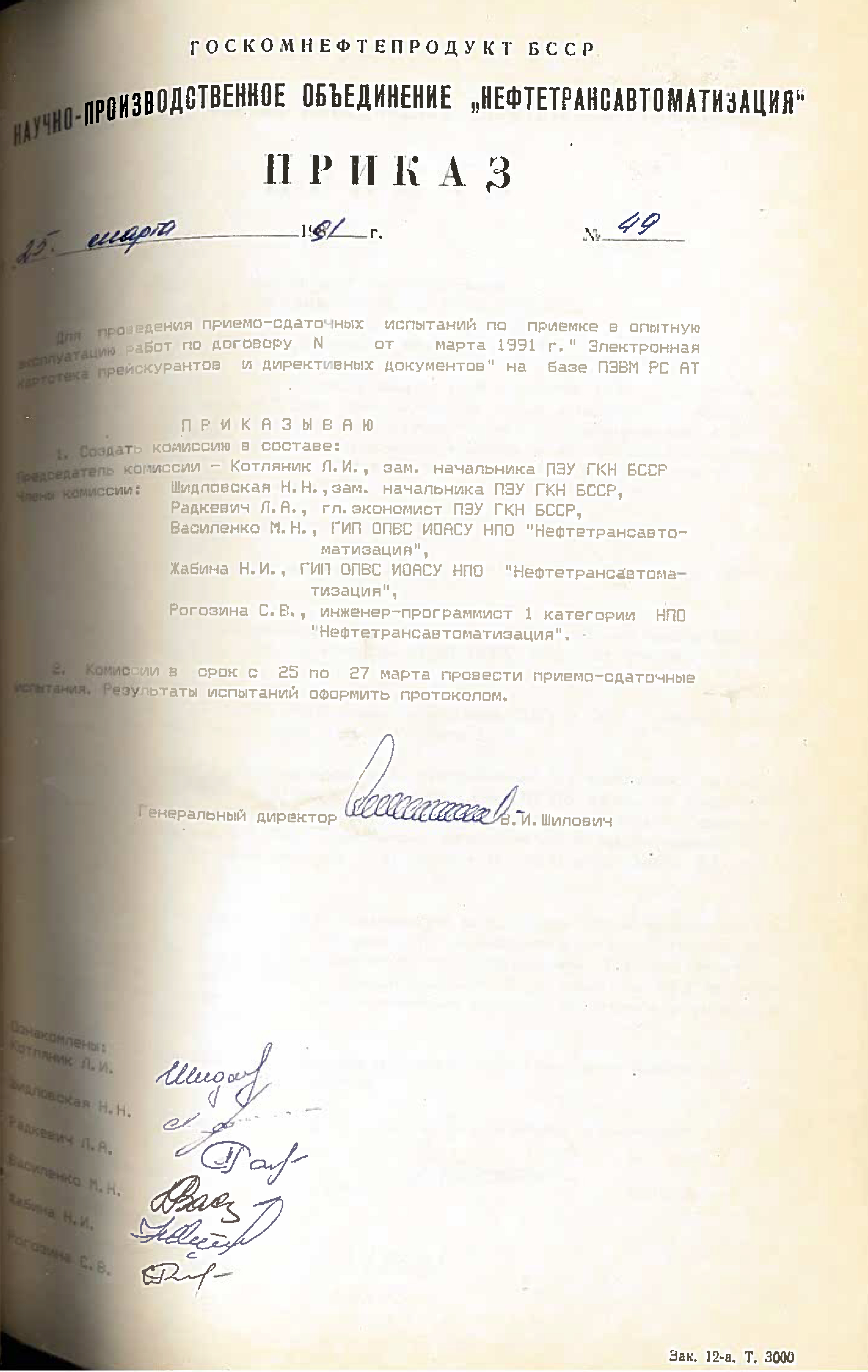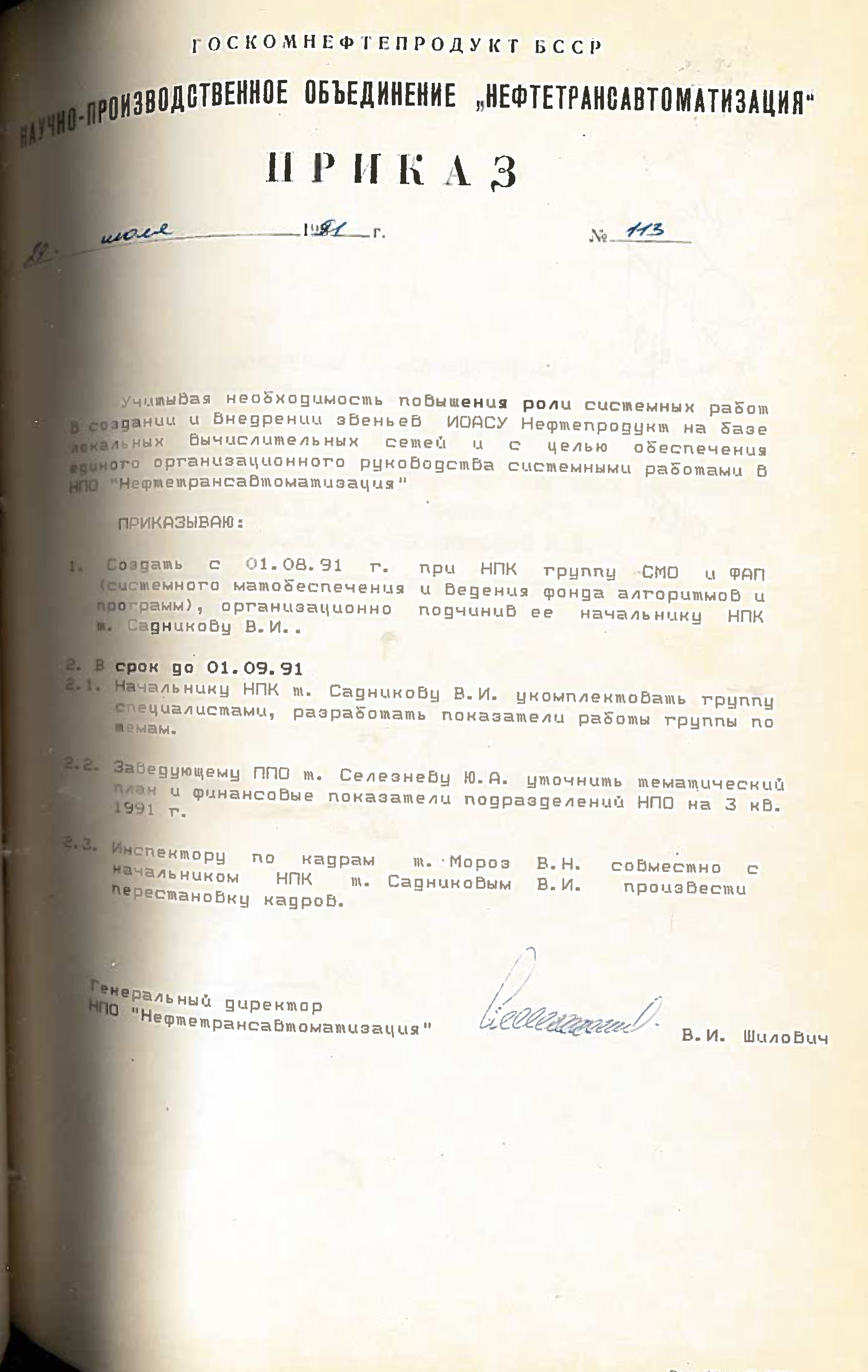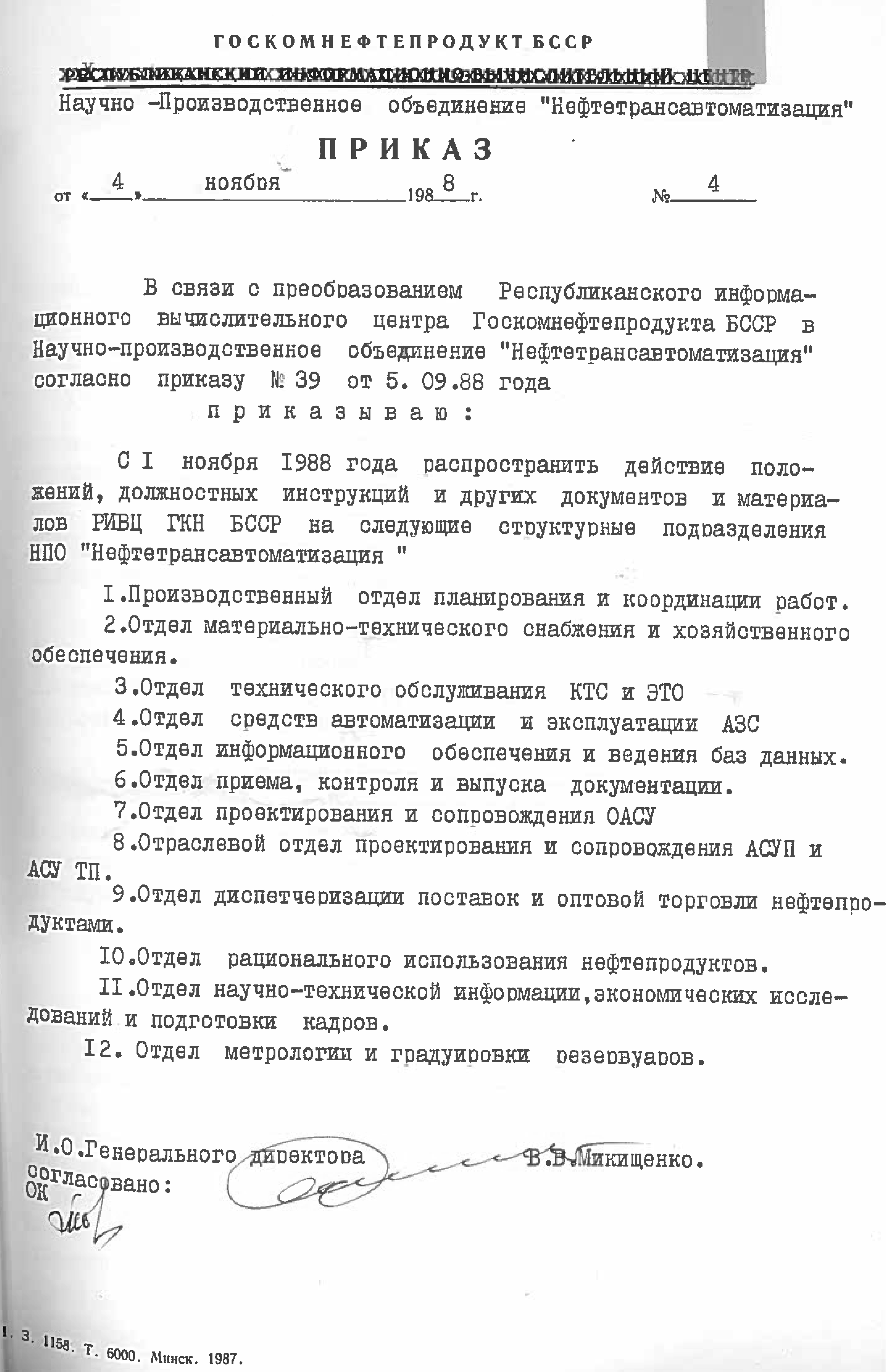 Это решение также подтверждается приказом НПО "Нефтетрансавтоматизации" №4 от 4 ноября 1988 года. Список работников РИВЦ, которые переведены в НПО "Нефтетрансавтоматизация", перечислены в штатном расписании, согласно приказу №3 от 03.11.1998.