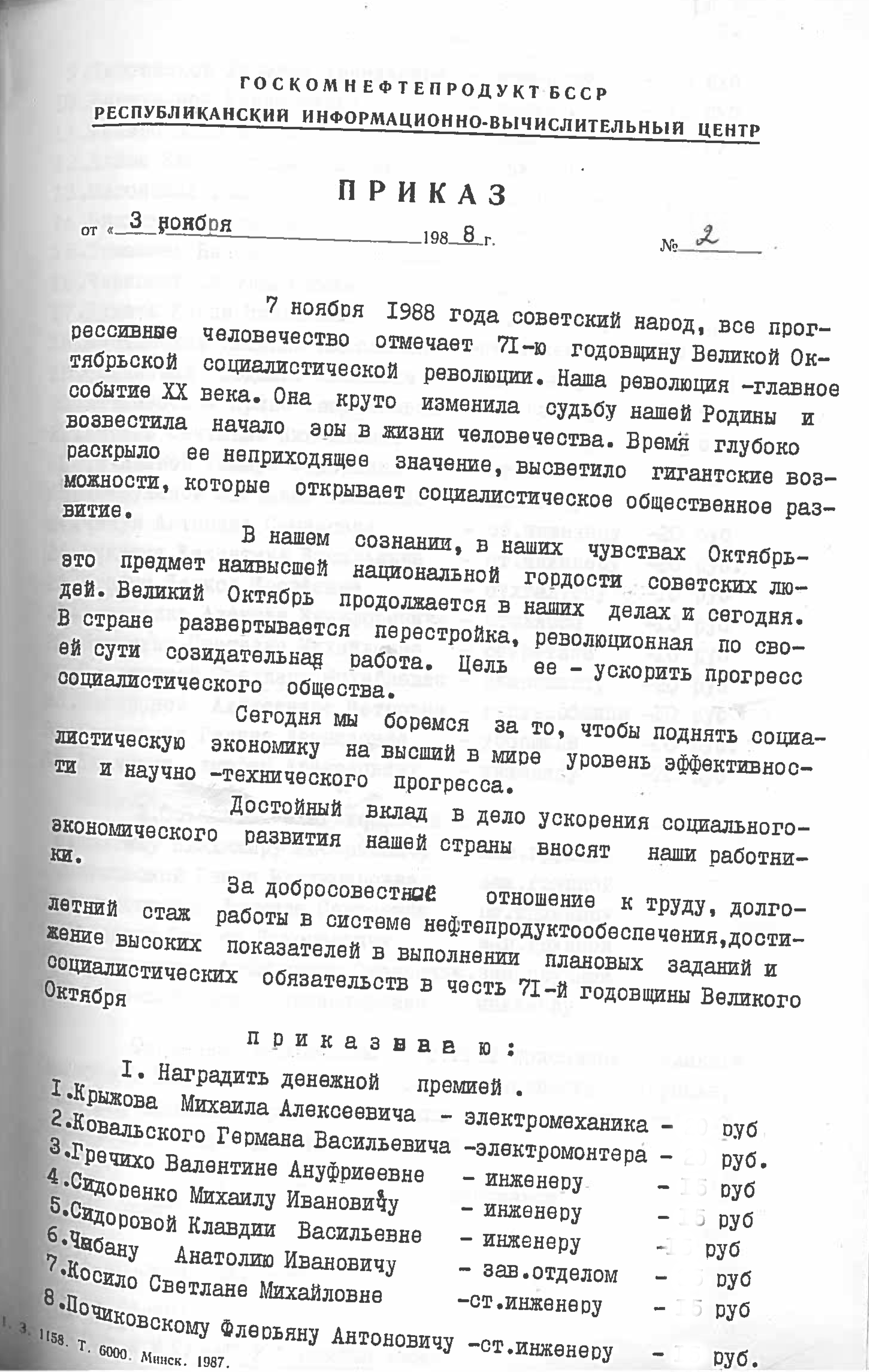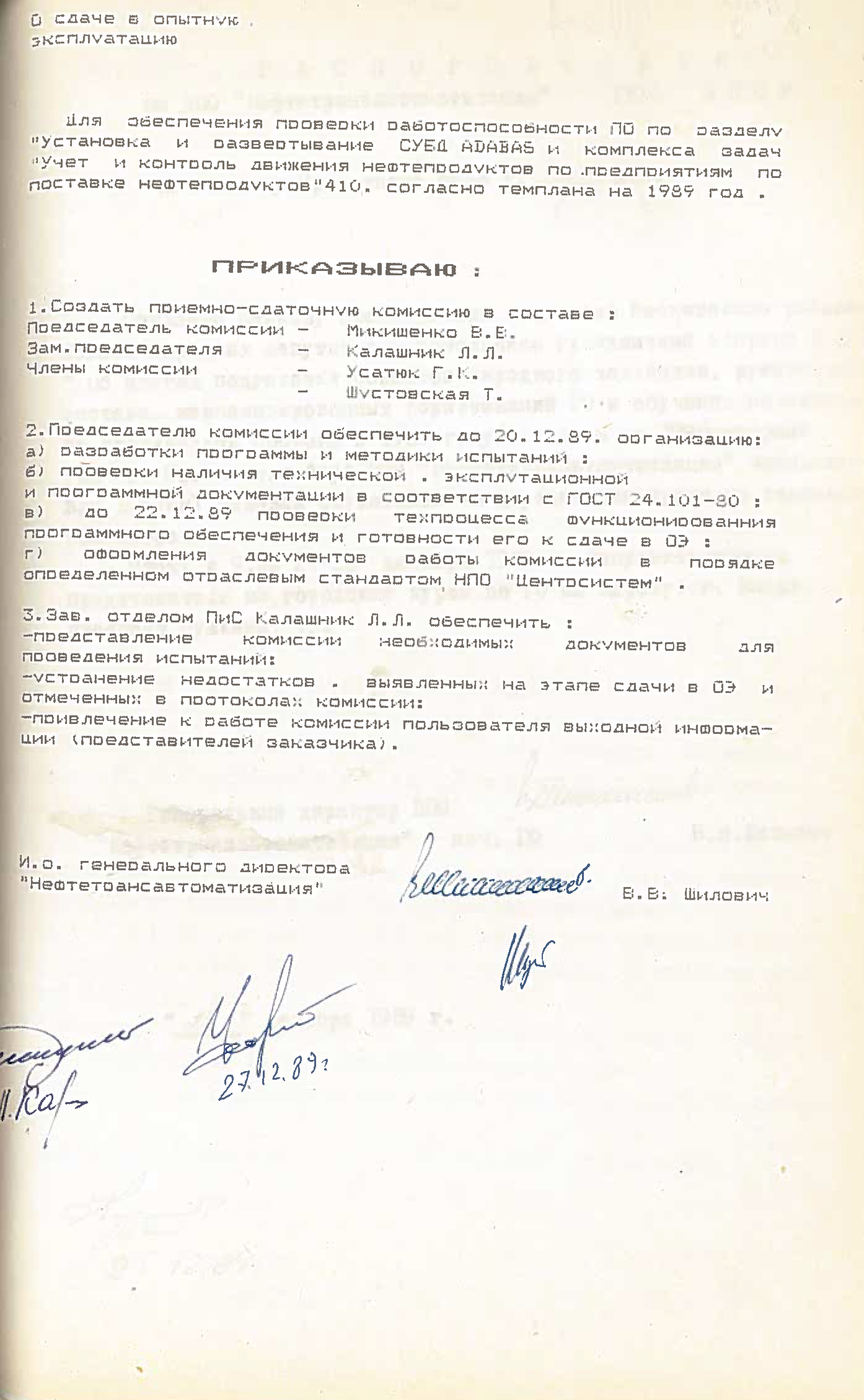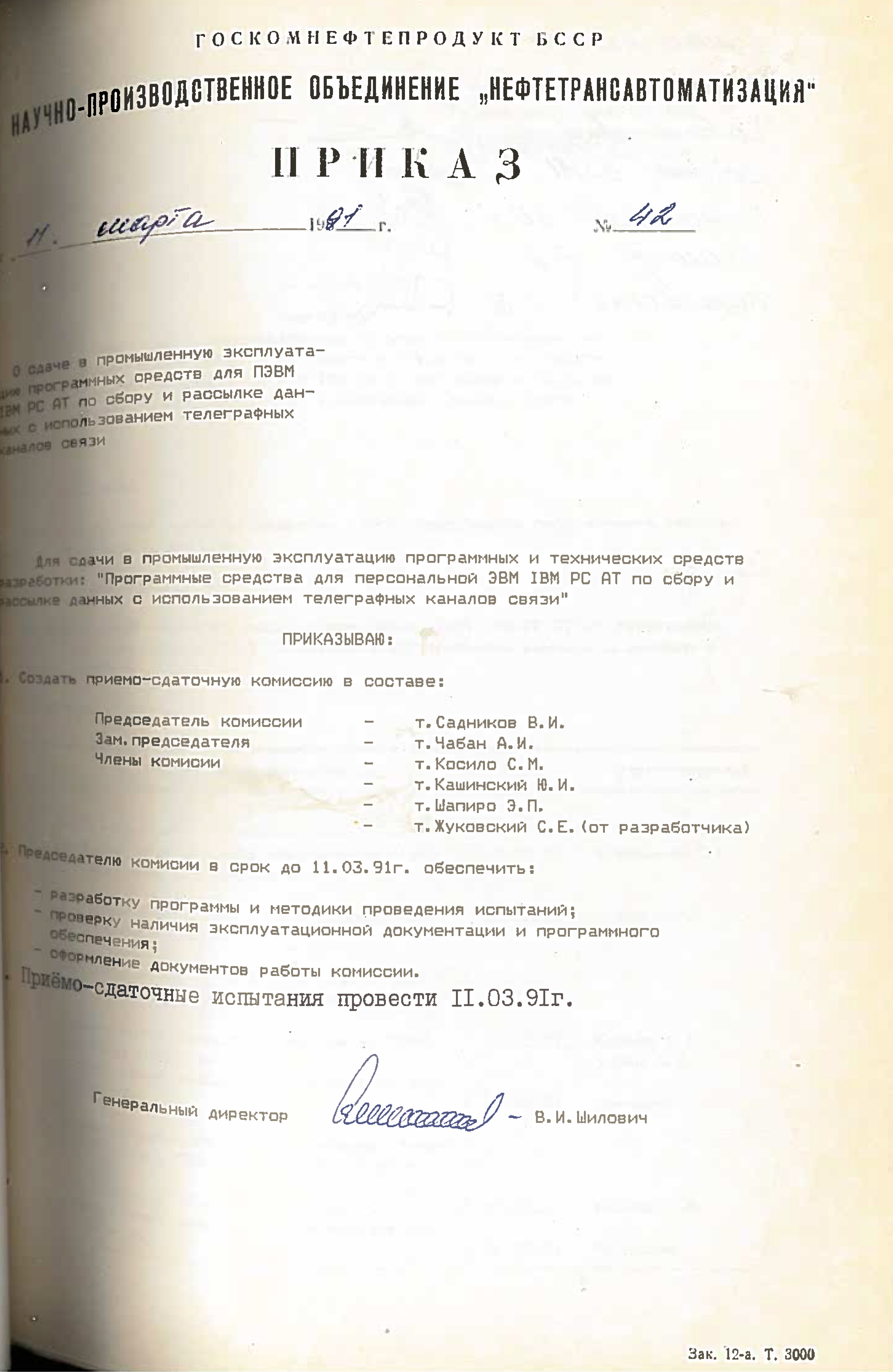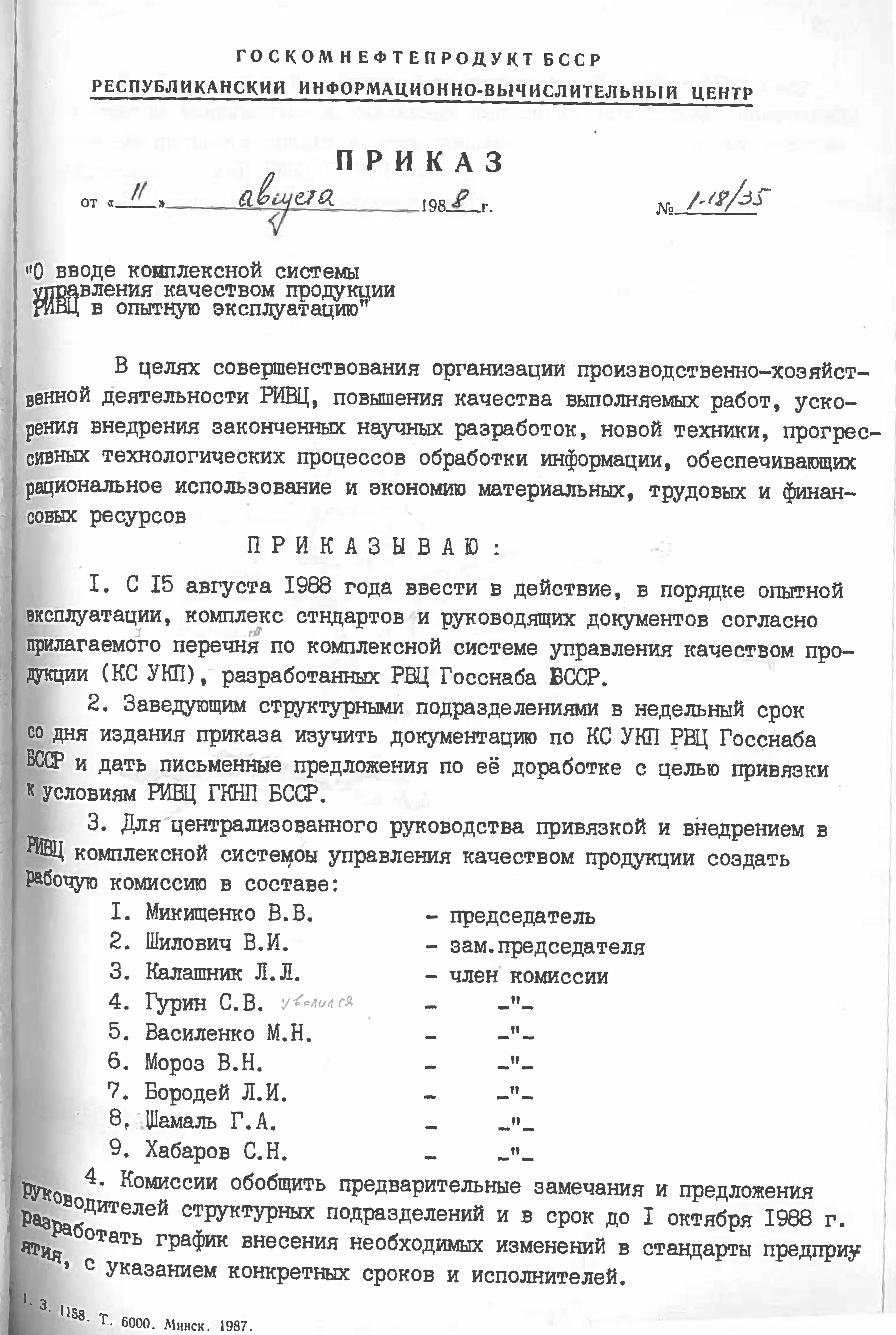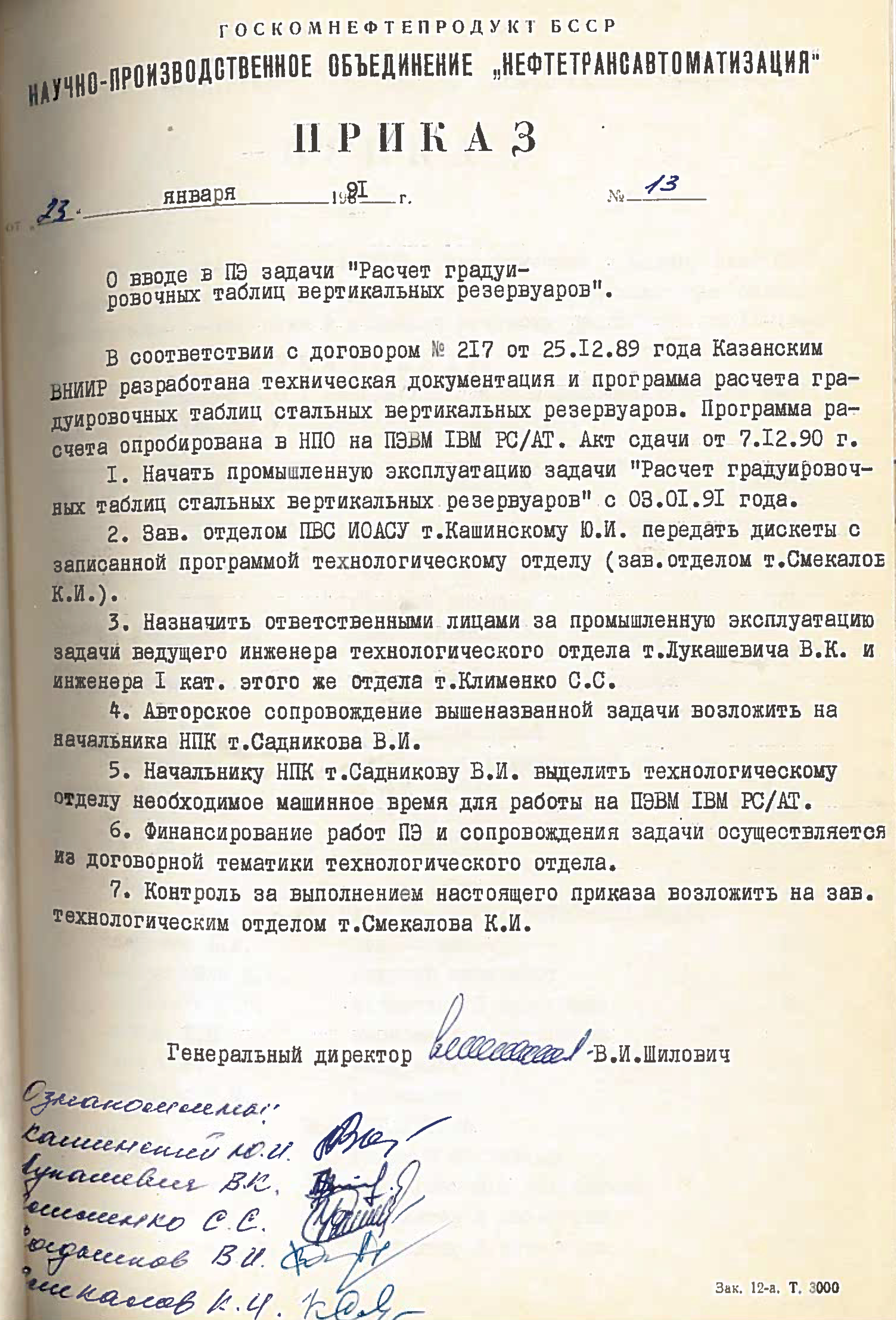 Это решение также подтверждается приказом НПО "Нефтетрансавтоматизации" №4 от 4 ноября 1988 года. Список работников РИВЦ, которые переведены в НПО "Нефтетрансавтоматизация", перечислены в штатном расписании, согласно приказу №3 от 03.11.1998.