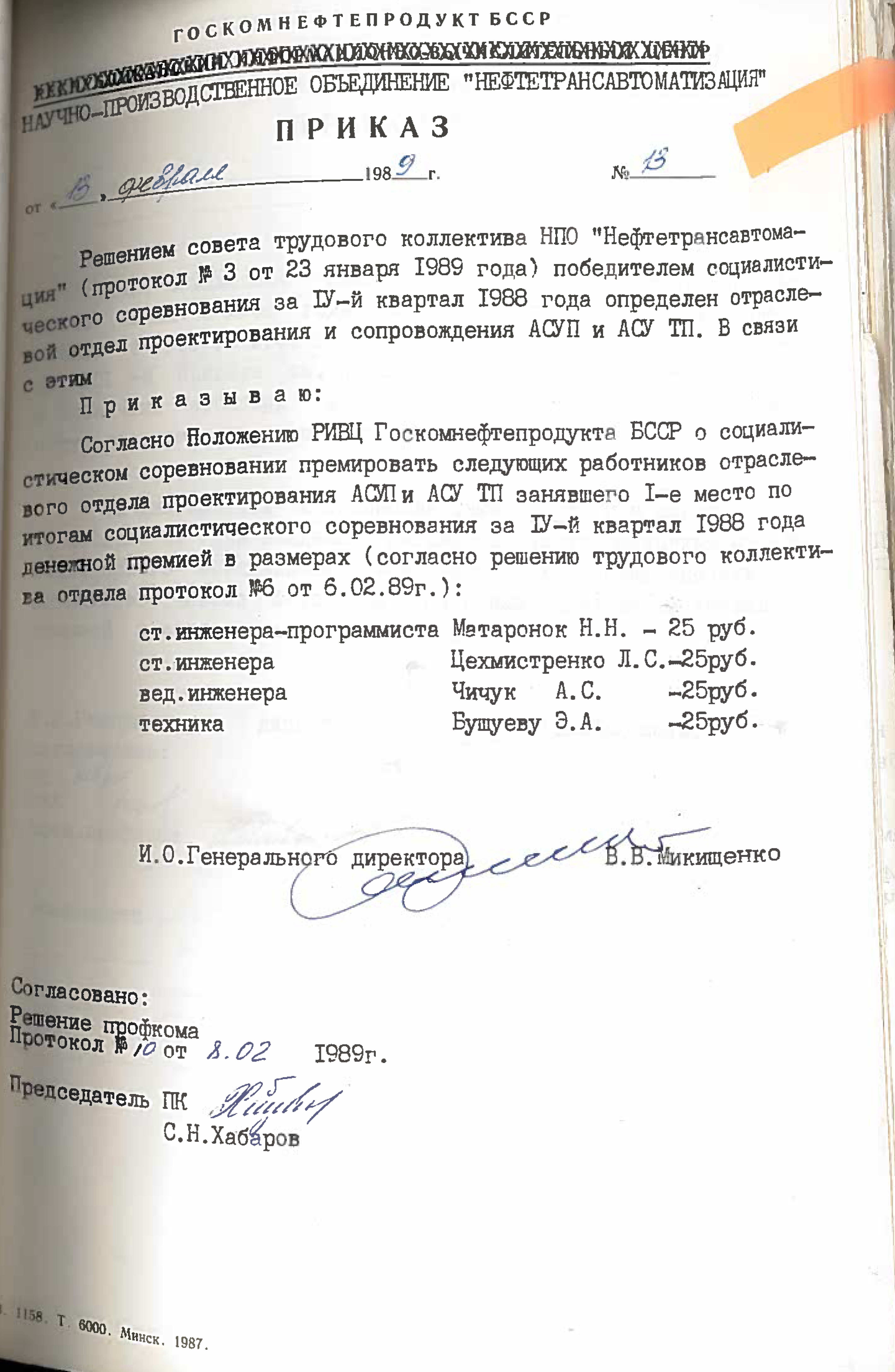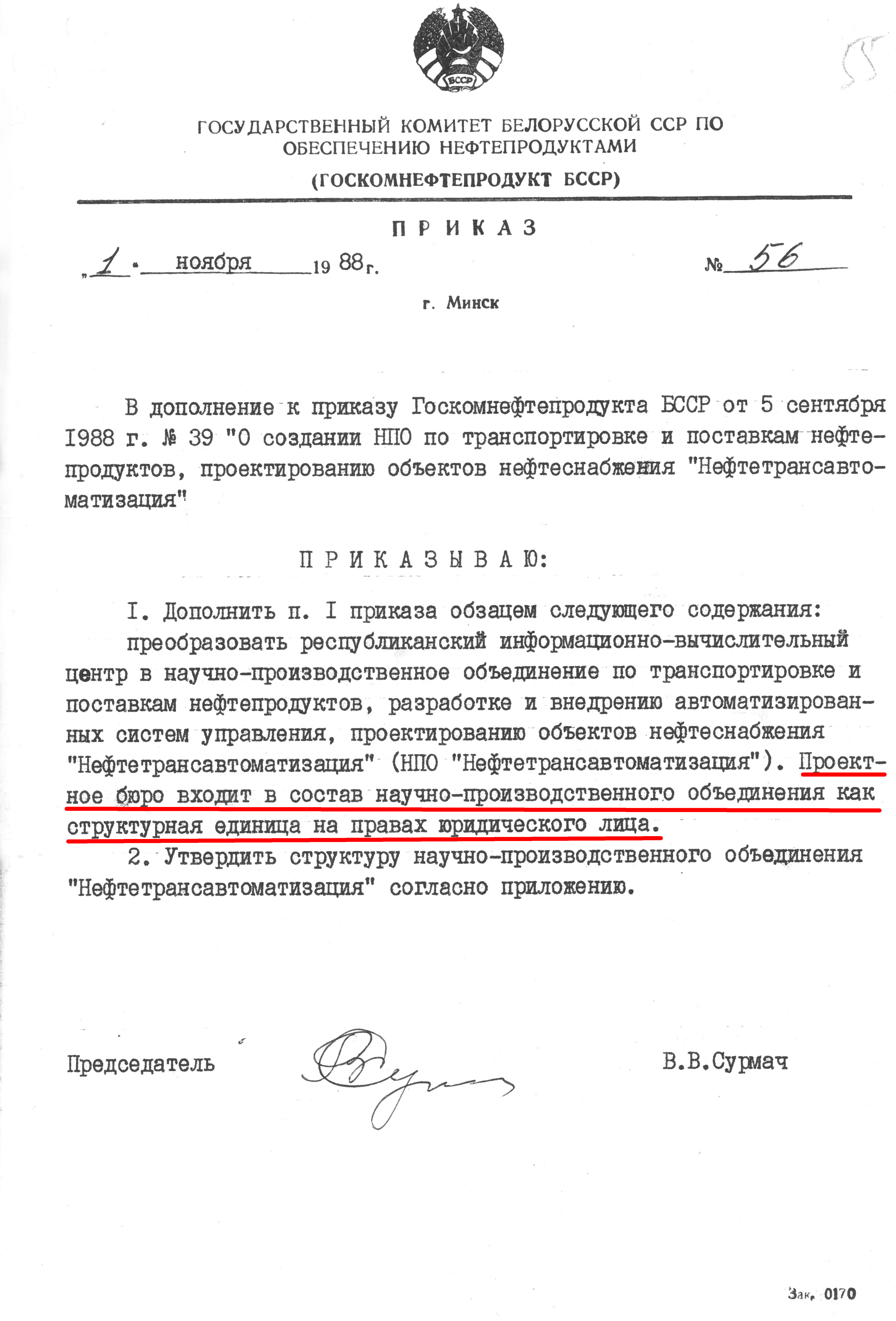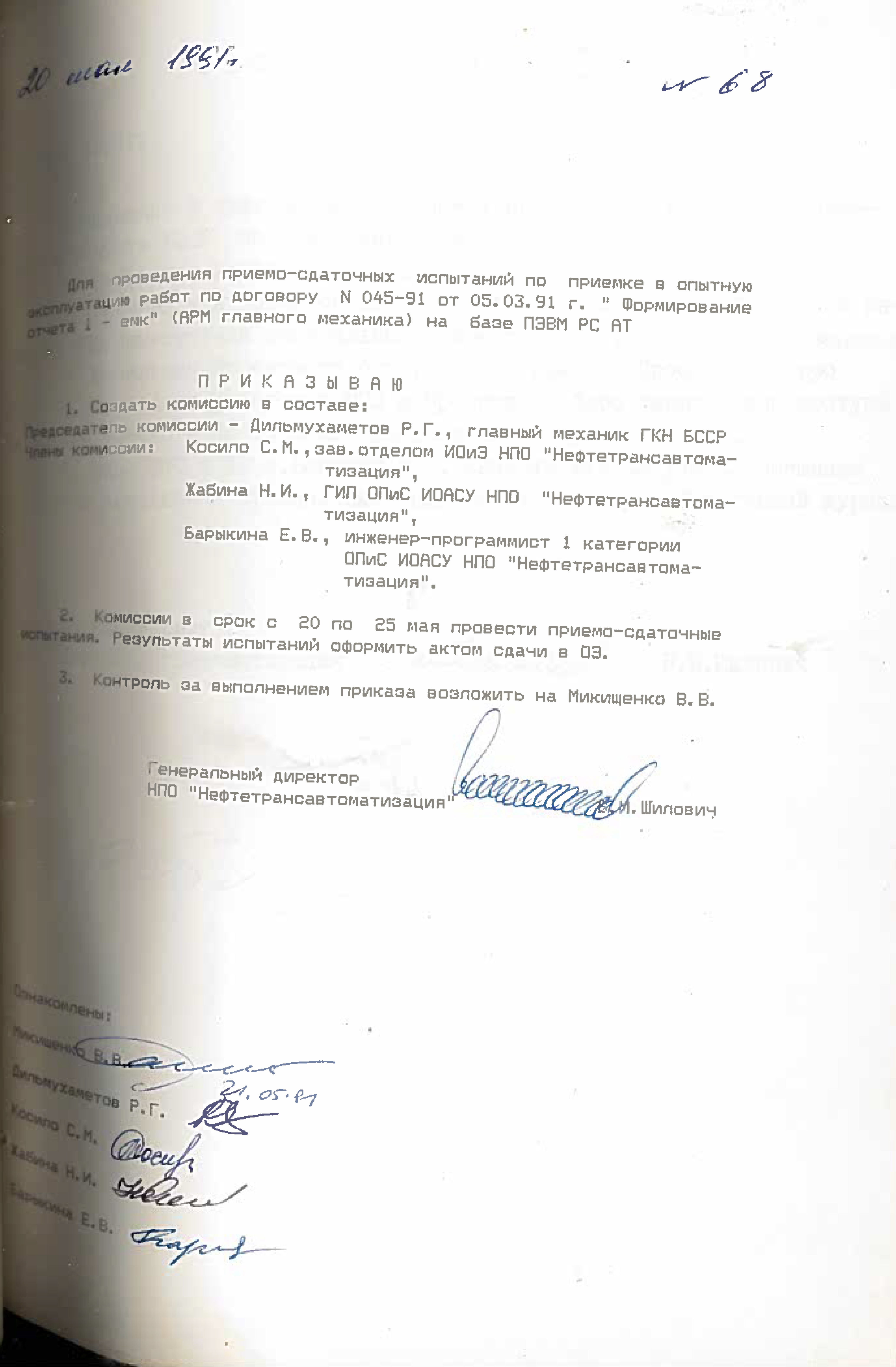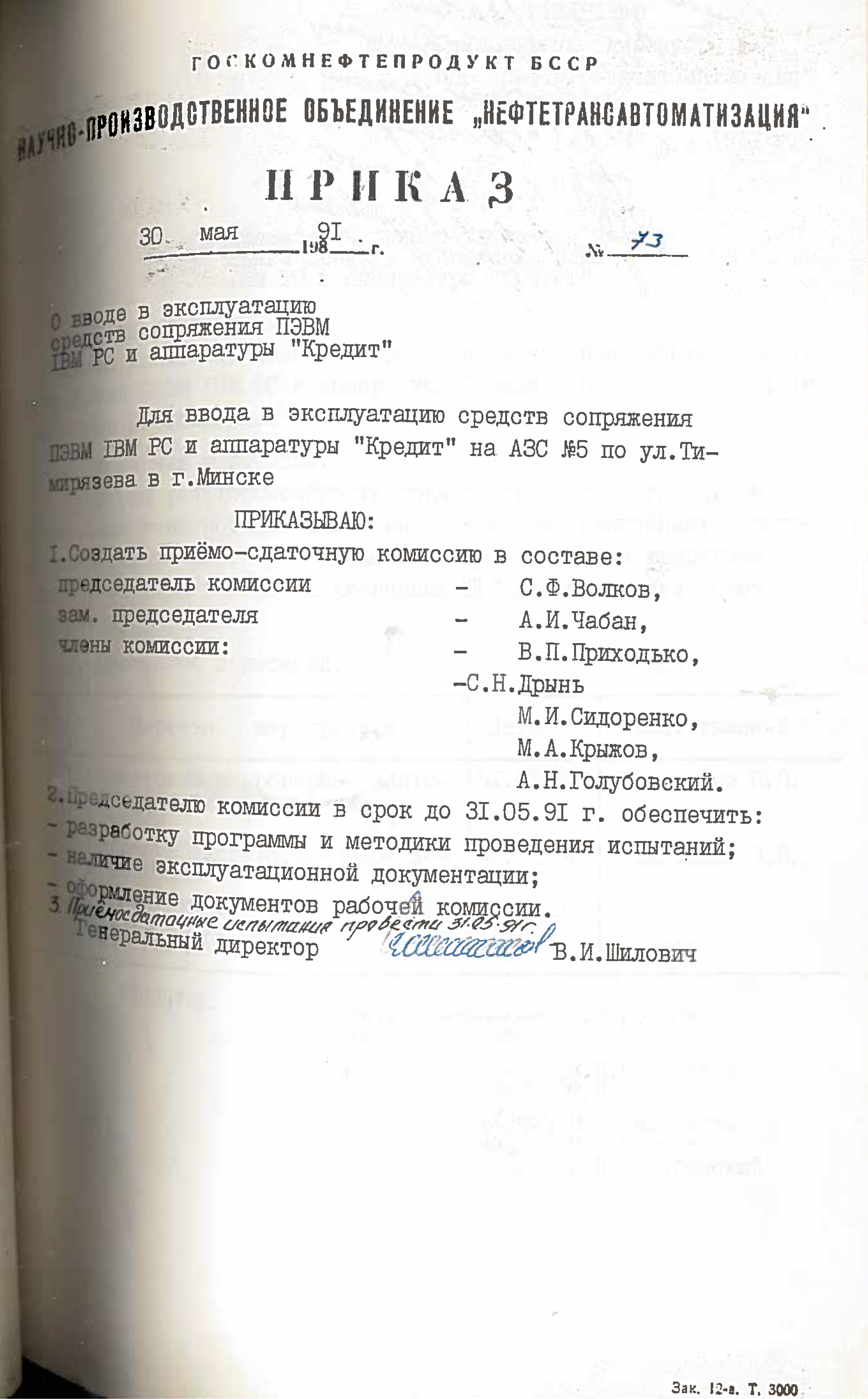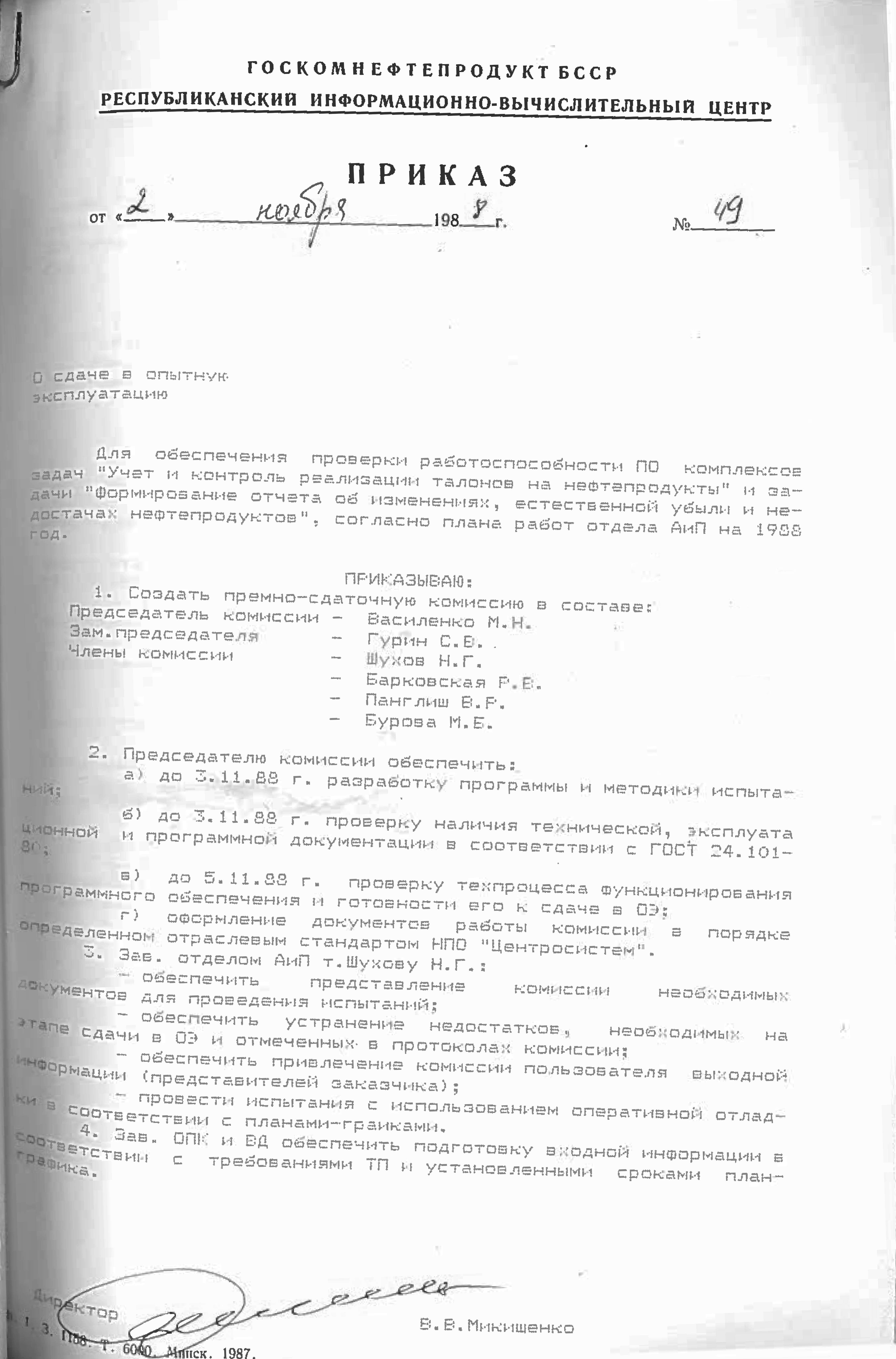 Это решение также подтверждается приказом НПО "Нефтетрансавтоматизации" №4 от 4 ноября 1988 года. Список работников РИВЦ, которые переведены в НПО "Нефтетрансавтоматизация", перечислены в штатном расписании, согласно приказу №3 от 03.11.1998.