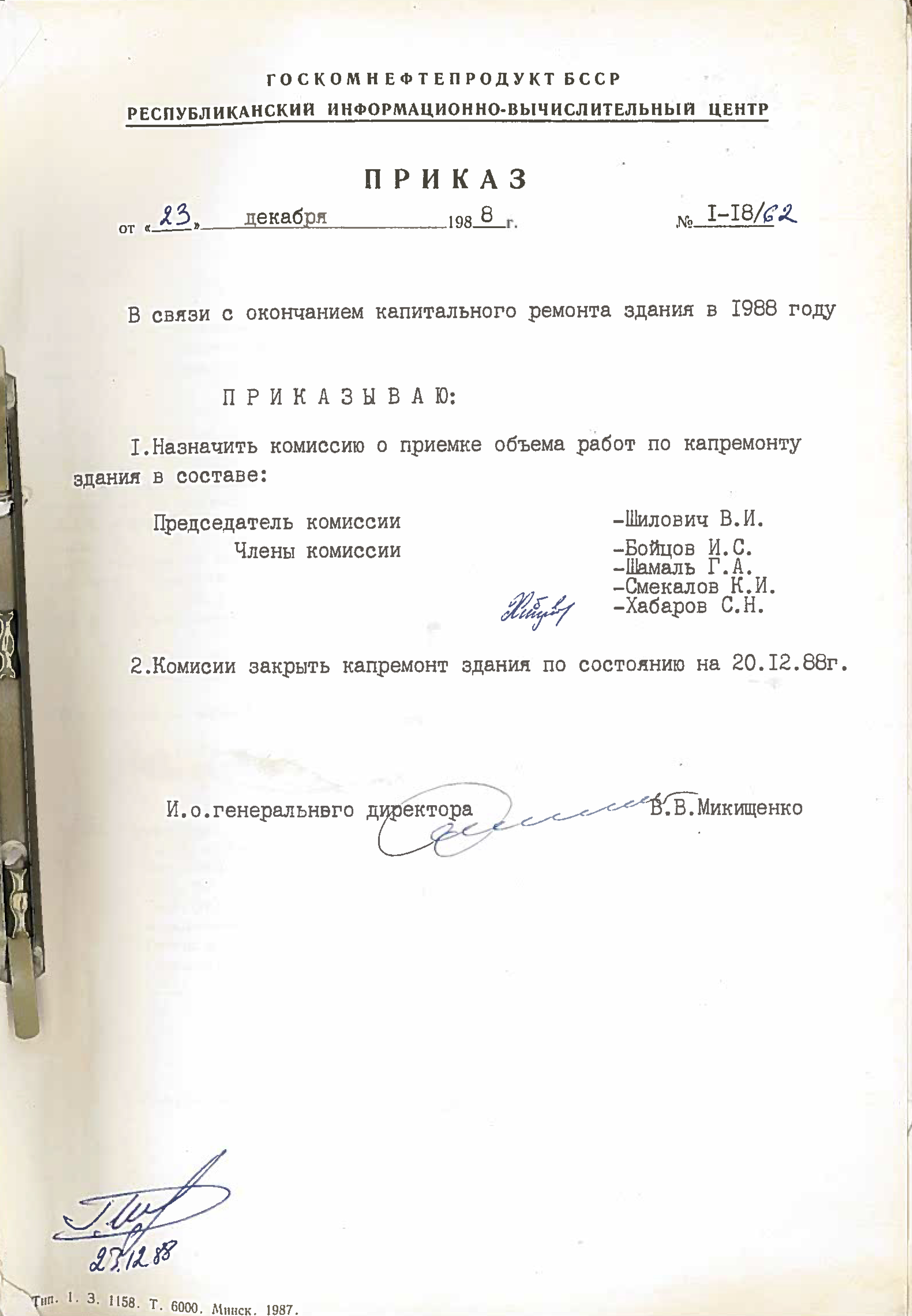 Декабрь 1988 года. Закончился капитальный ремонт здания. 23 декабря 1988 года приказом назначена комиссия по приемке объема работ по капремонту здания.