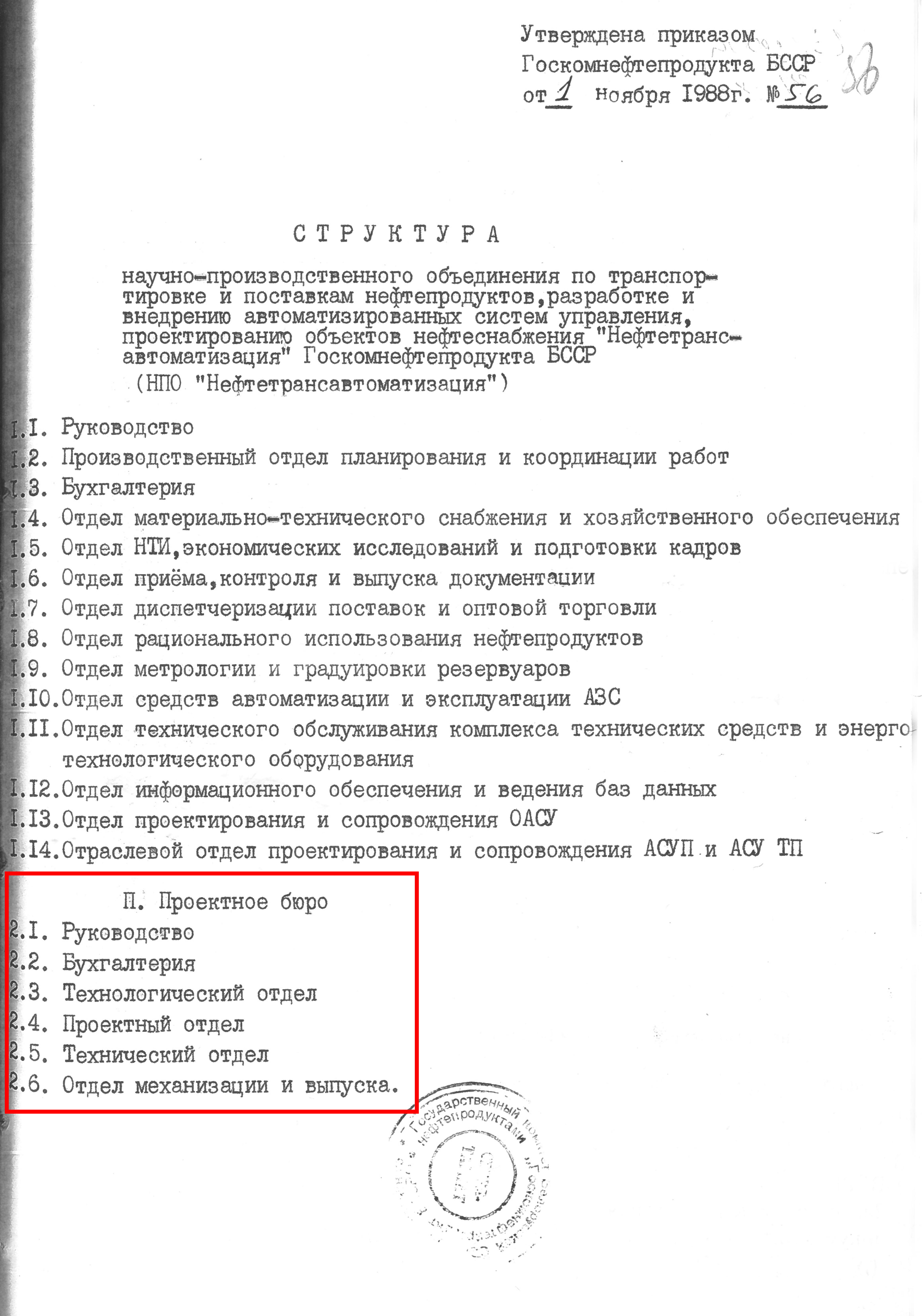 Проектное бюро входит в состав НПО "Нефтетрансавтоматизация" как структурная единица на правах юридического лица (приказ №56 от 01.11.1988 Госкомнефтепродукта БССР)