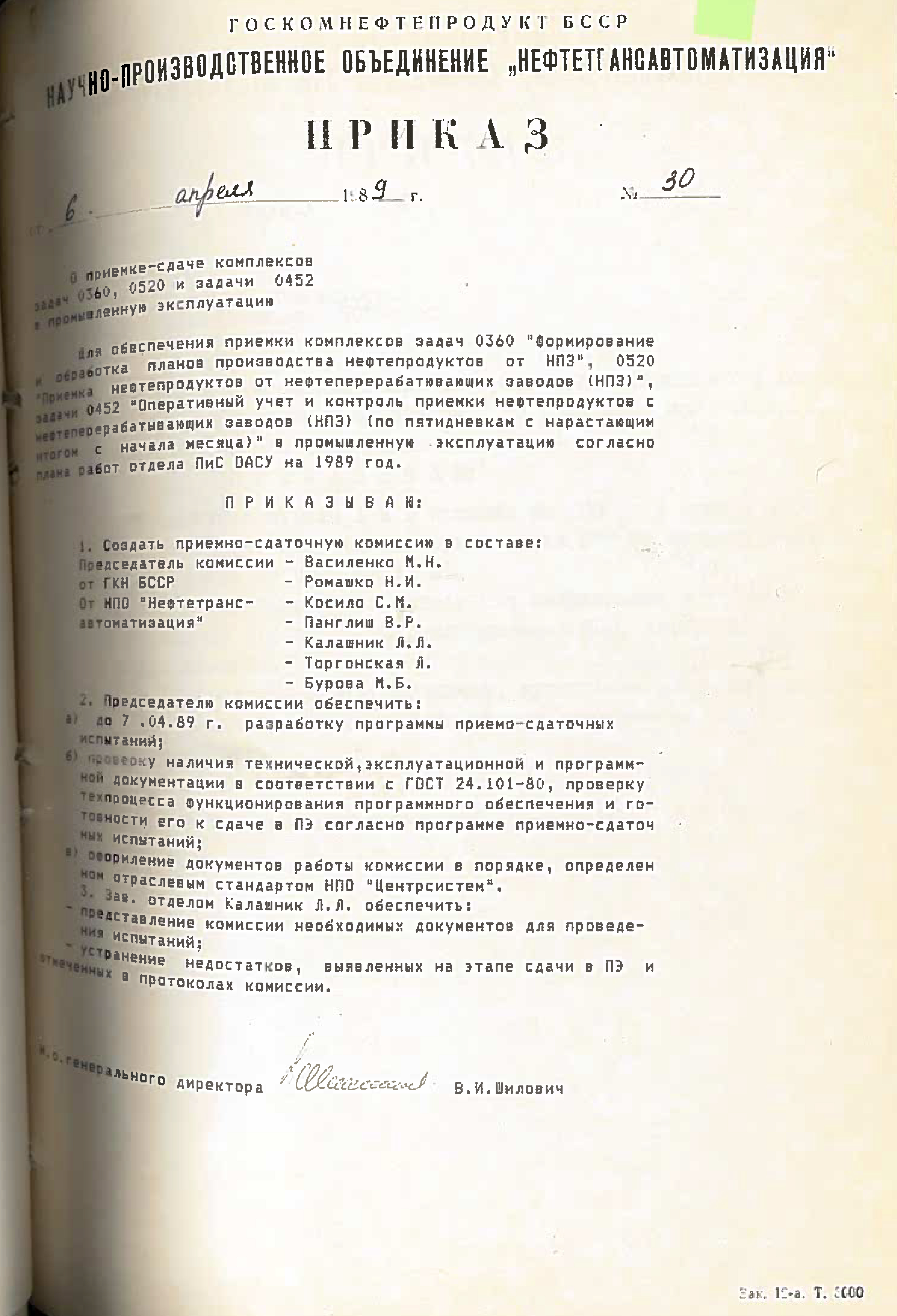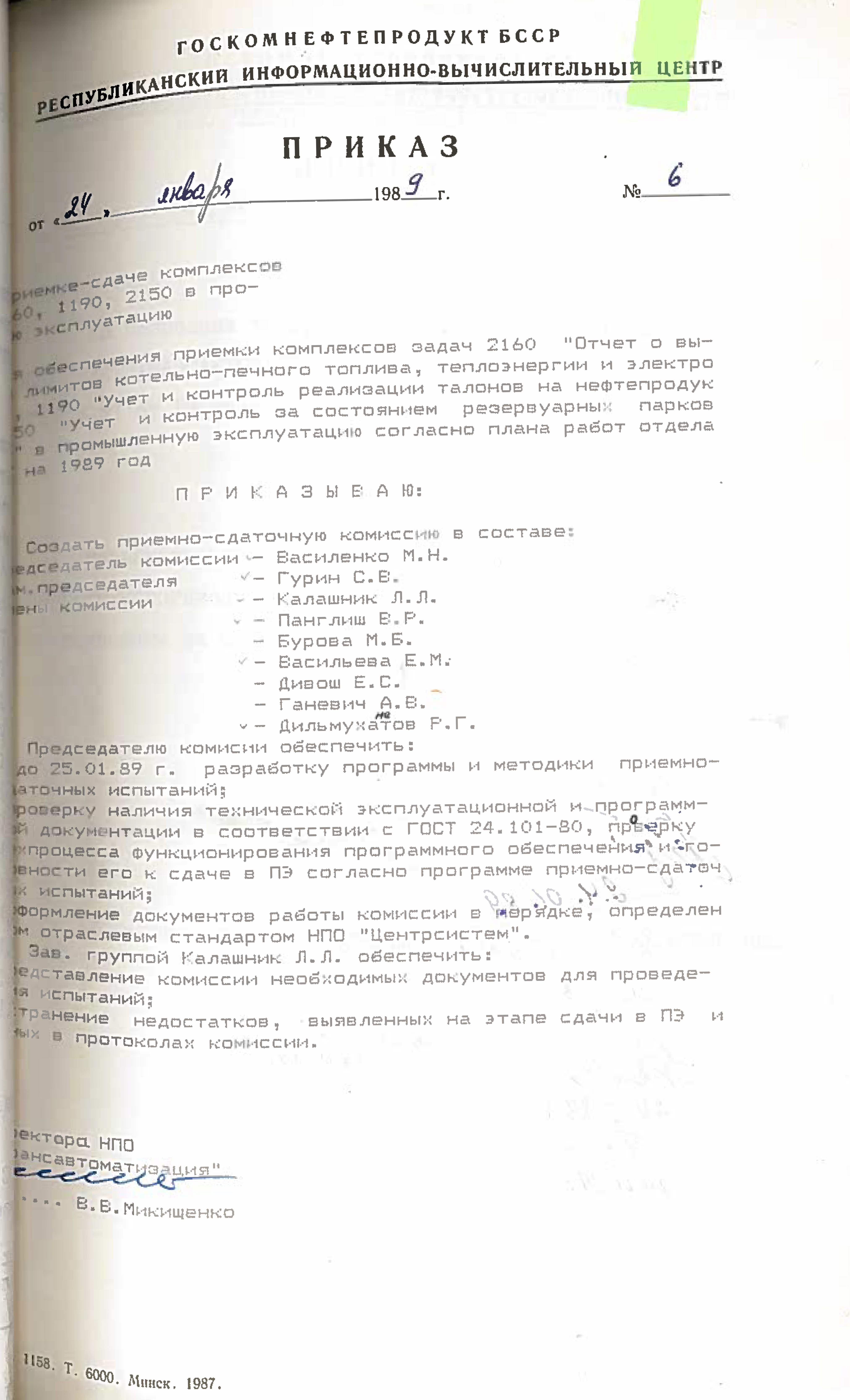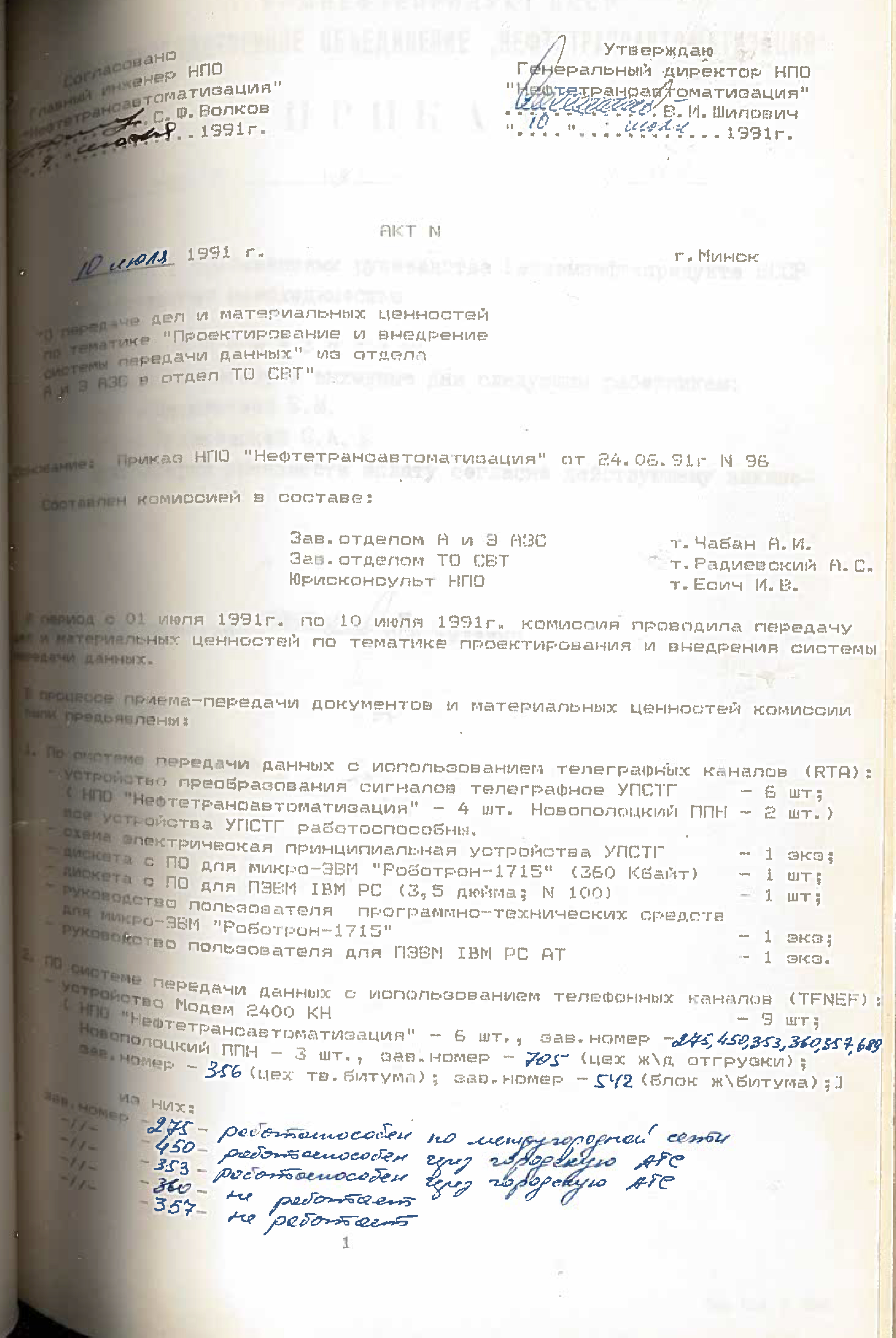 - “Привязка и внедрение АСУП нефтерподукт ПОН, ПО Брестоблнефтепродукт, Гроднооблнефтепродукт и Гомельоблнефтепродукт - ведущий инженер т.Минченко В.П., при этом эти обязанности сняты с зав. отделом т.Кашинского Ю.И. и зам. зав. отделом т.Селянского А.В.