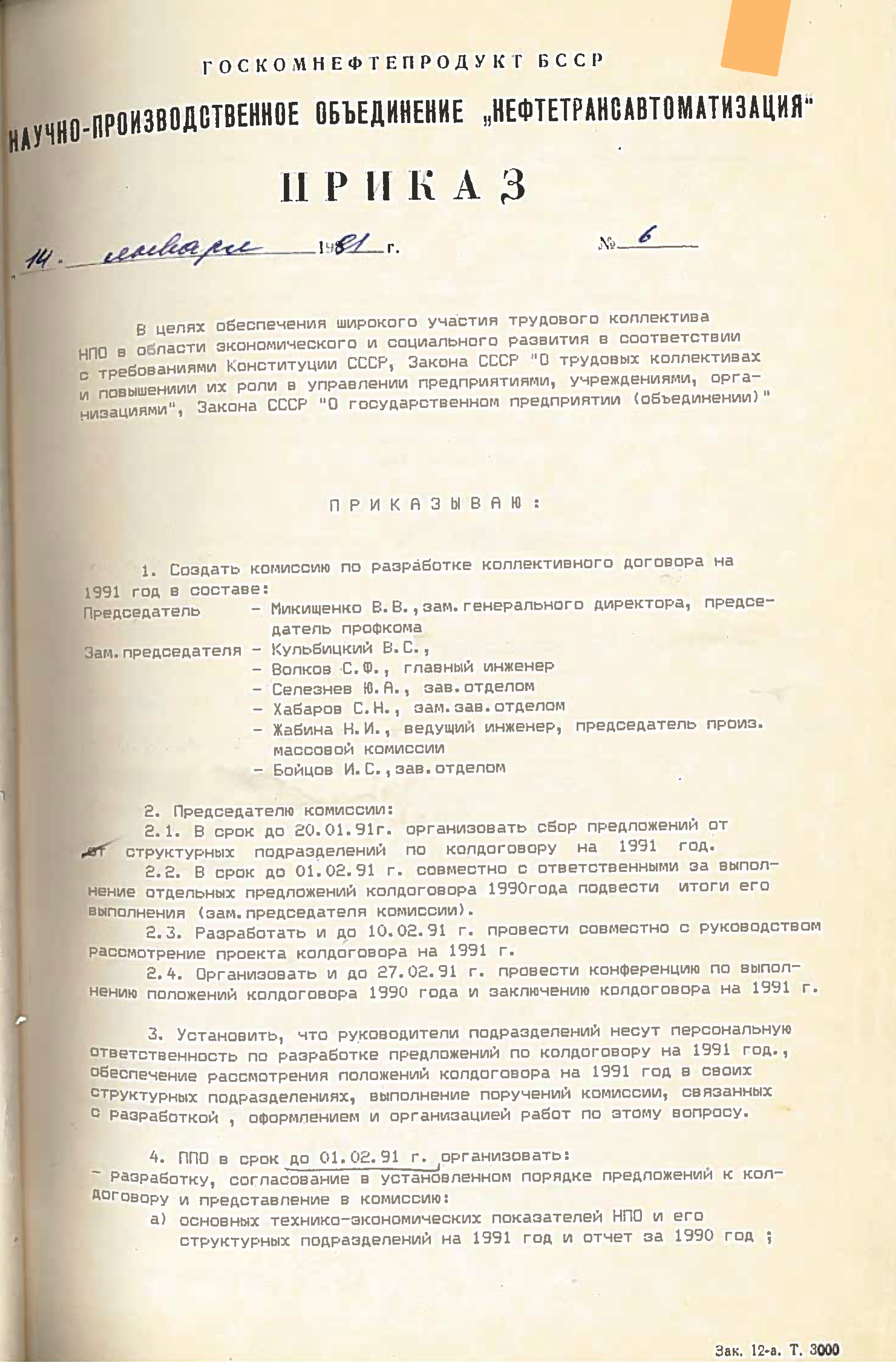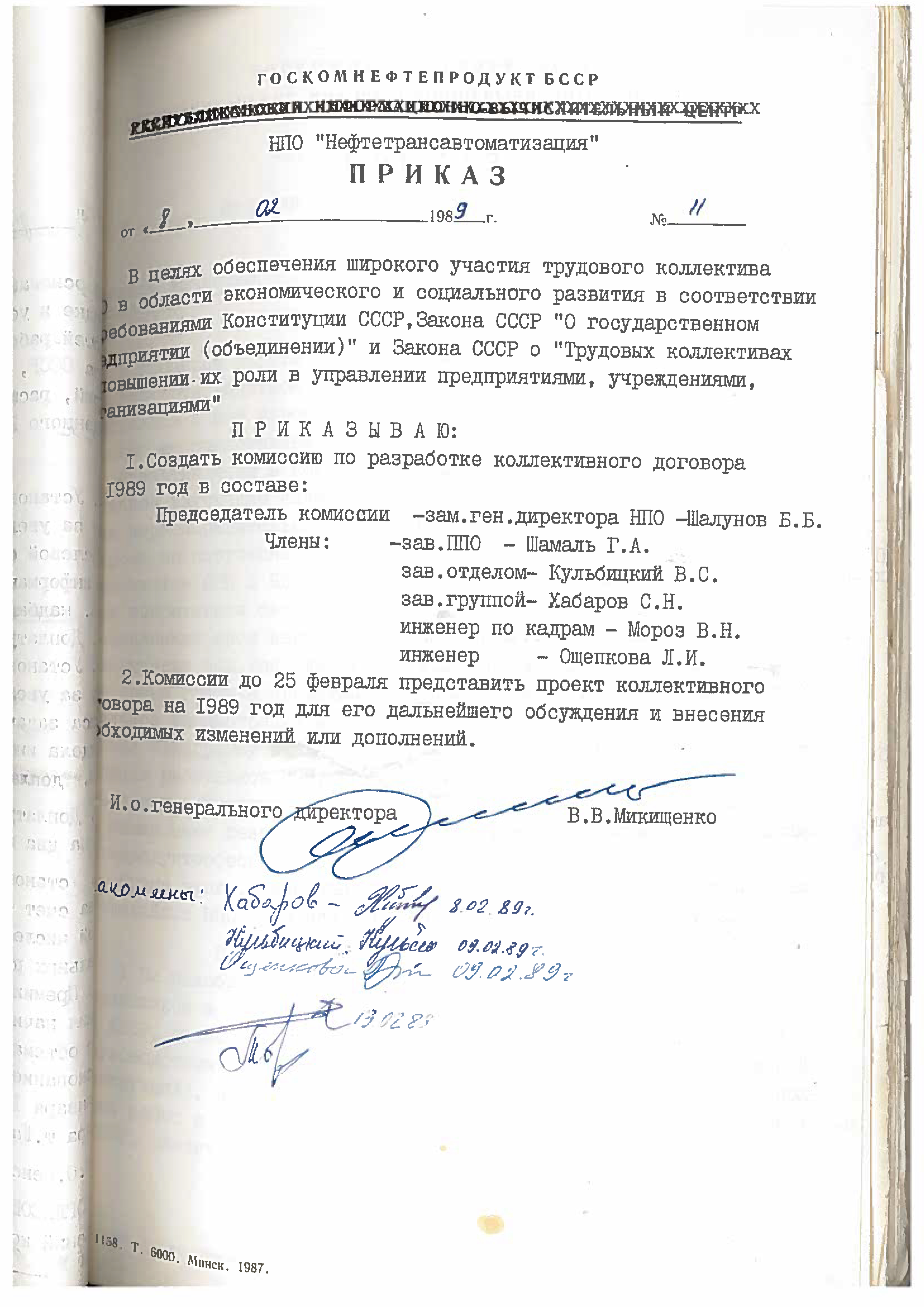 13 декабря 1988 года назначались выборы Генерального директора НПО «Нефтетрансавтоматизация». Была создана конкурсная комиссия, которая принимала заявления на замещение вакантной должности Генерального директора и назначала выборы (приказ №1-18/52 от 13.12.1988). Выборы генерального директора изначально назначены на 18 октября 1989, но позже выбрана другая дата - 26 января 1989 года (согласно приказу №73 от 25.08.1989 года):