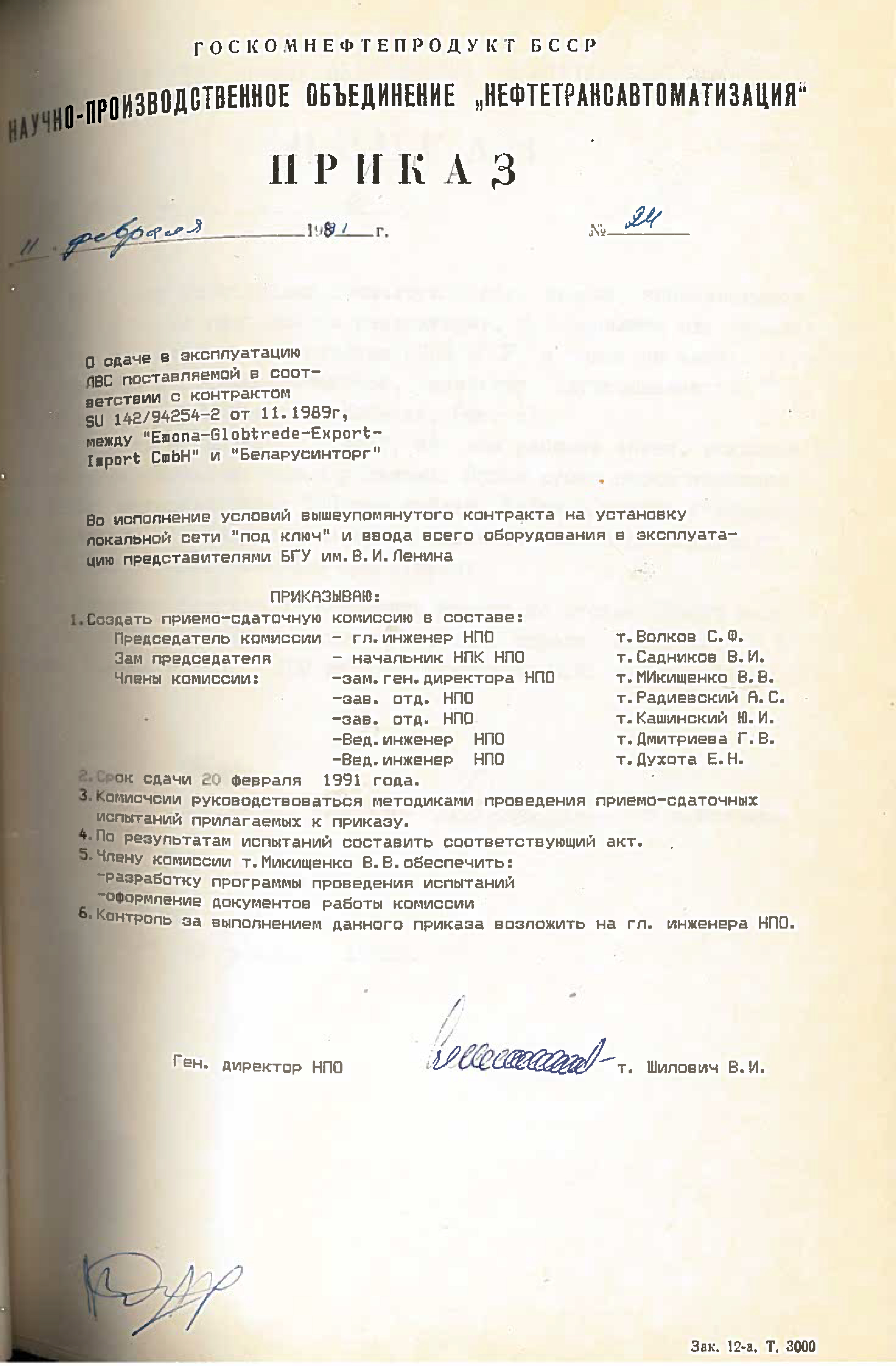- Сдача в эксплуатацию ЛВС поставляемой в соответствии с контрактом SU 142/94254-2 от 11.1989г., между «Emona-Glebtrede-Export-Import CmbH» и «Беларусинторг» (установка локальной сети «под ключ»)