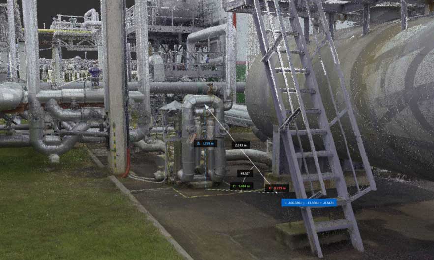 Лазерное сканирование – самая надёжная технология, позволяющая получить точную цифровую копию промышленного объекта. Облако точек дает возможность выполнить визуальную оценку объекта, измерения между любыми (даже труднодоступными) конструктивными элементами сооружения без непосредственного присутствия специалиста.